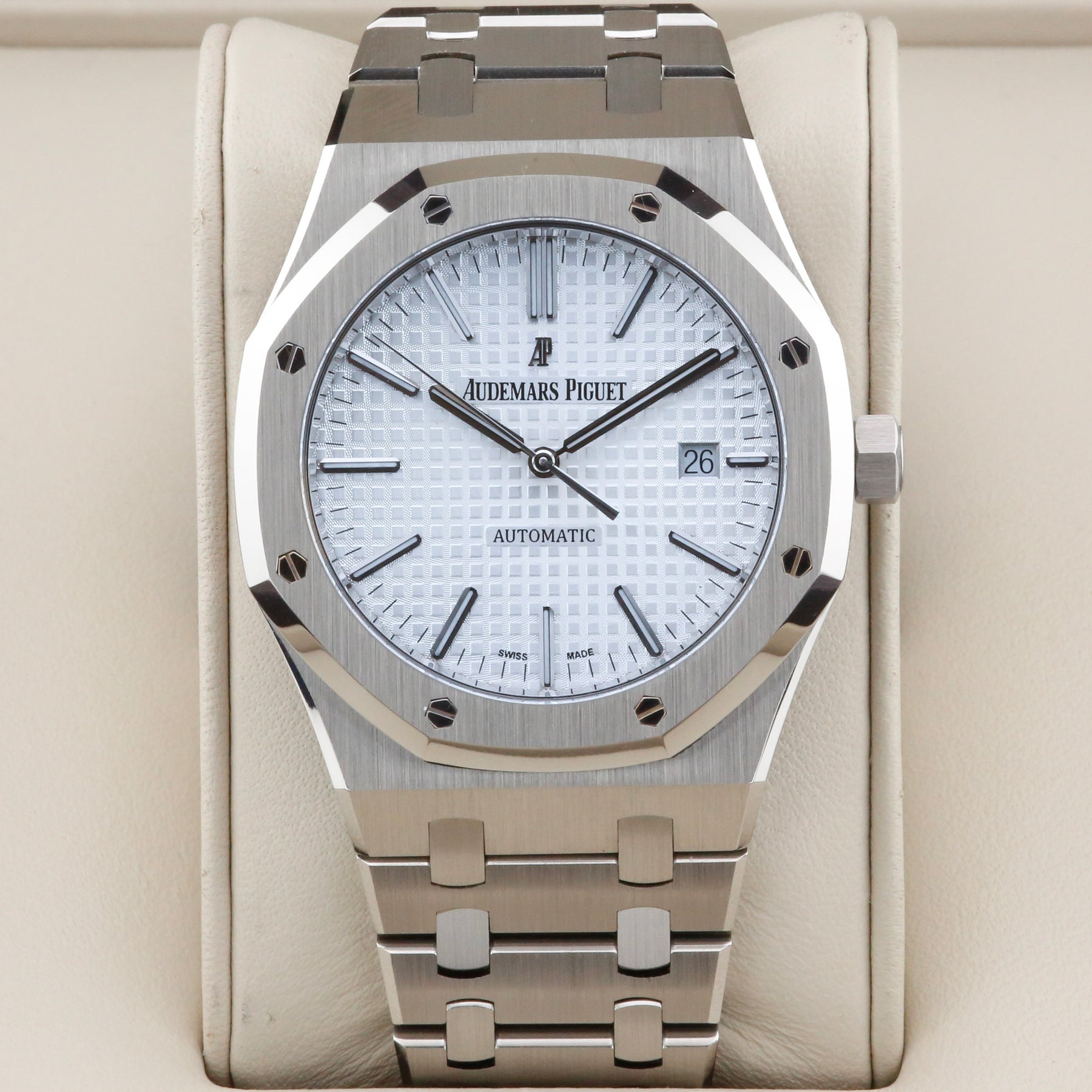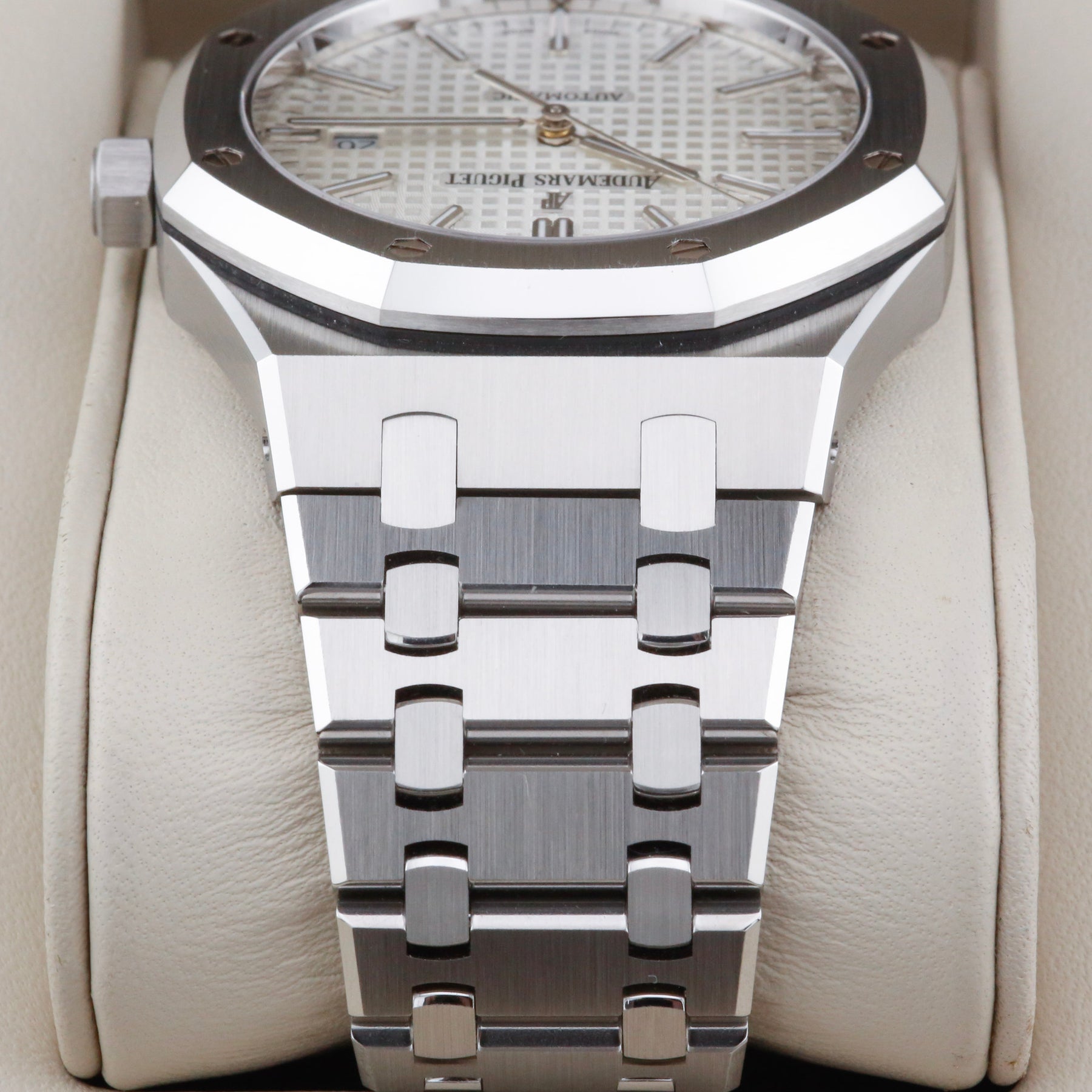 The Audemars Piguet Royal Oak 15400ST is the 41mm evolution of the iconic Royal Oak design, featuring the signature octagonal bezel with exposed screws and integrated stainless steel bracelet. The larger case size gives the watch a strong presence on the wrist while retaining the slim, elegant profile that has defined the Royal Oak since its introduction. A silver “Grande Tapisserie” dial with applied hour markers and date at 3 o’clock completes the classic AP sports-luxury look.