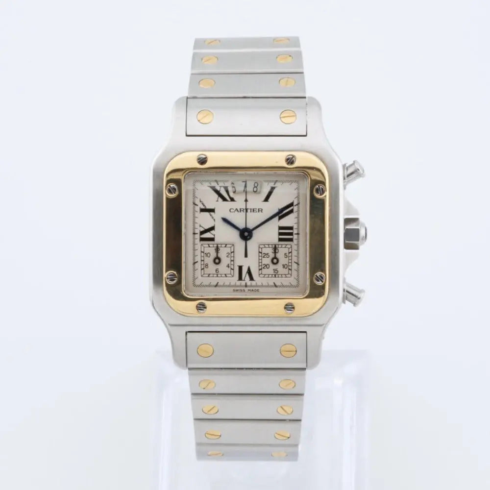 This Cartier Santos Galbée Chronograph 2425 is in stock and available at our showroom in London. The watch features the classic Galbée design and comes in the perfect 29mm case size. The case and bracelet on this Cartier Santos Galbée are both crafted with 18ct yellow gold and stainless steel. The watch is in excellent condition and is sold with its original box and papers. A watch register certificate and a 12-month warranty are also included.