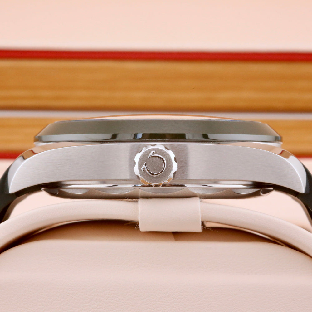 This Omega Aqua Terra World Timer Green 22032432210001 is in unworn condition and sold as a complete set including the original box and papers. A watch register certificate and the remainder of the manufacturer's warranty are also included.