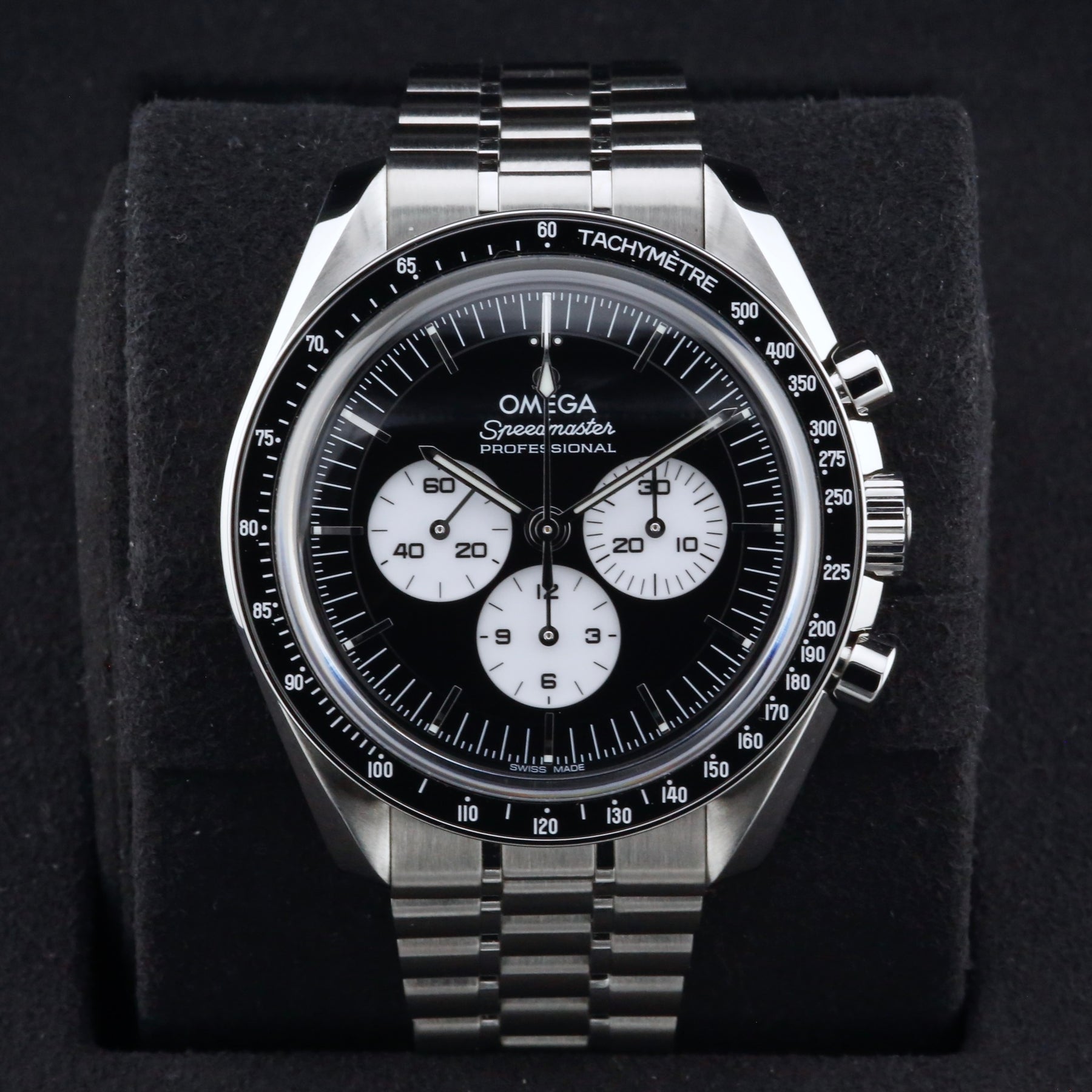 The Omega Speedmaster Moonwatch Professional 310.30.42.50.01.004 is the latest model of the legendary Moonwatch, taking design inspiration from the fourth-generation Speedmaster worn on the moon. Crafted from stainless steel, it features a 42mm case, black stepped dial with contrasting white sub-dials and a black ceramic bezel with the sought-after dot over 90, giving the watch a crisp, modern “reverse panda” look while retaining the unmistakable design of the original Speedmaster.