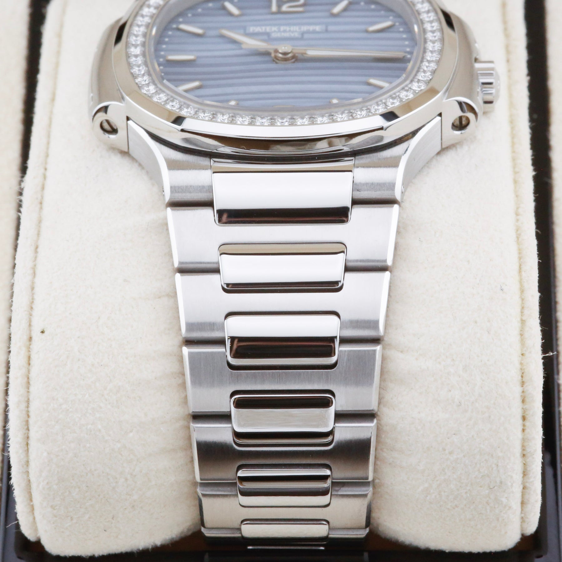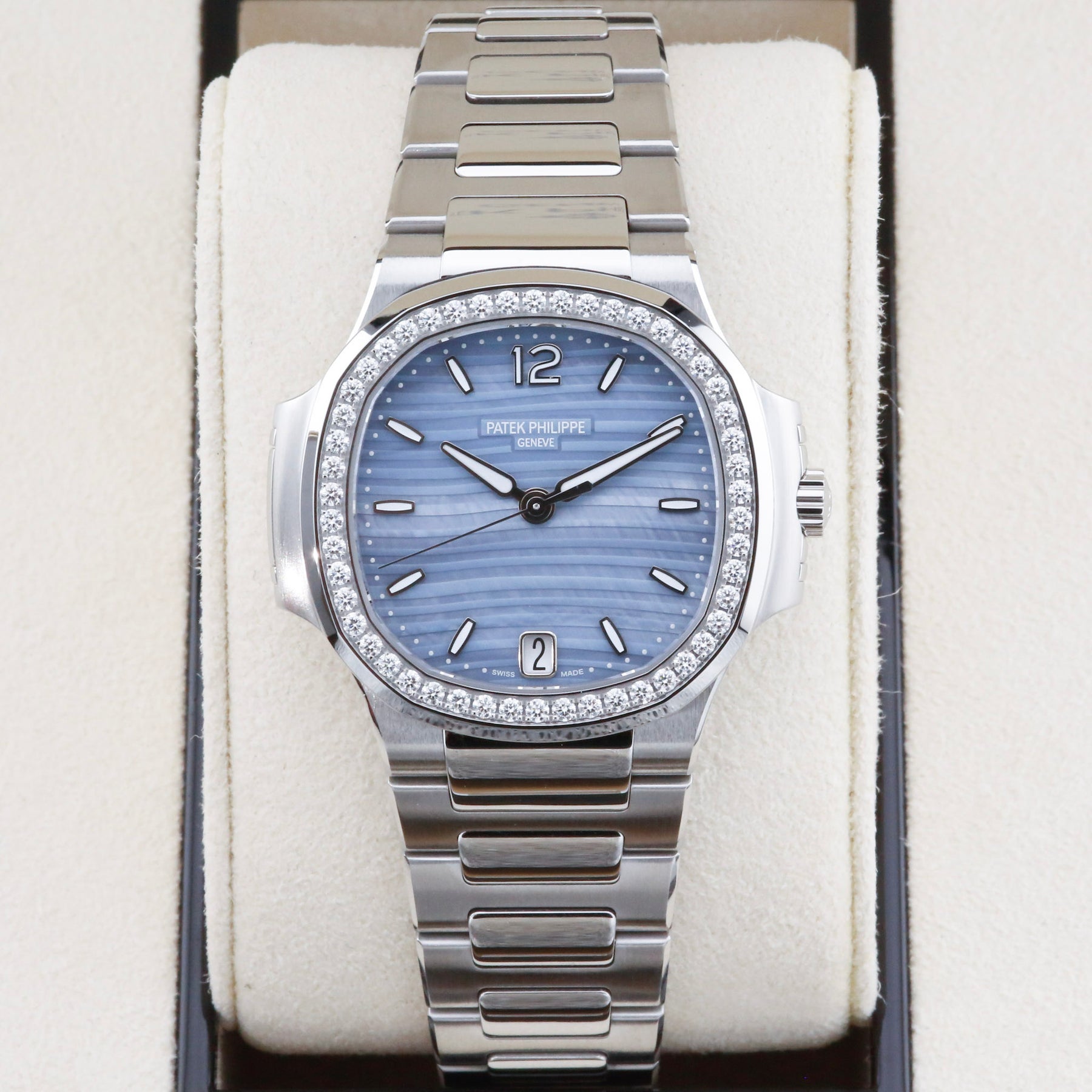 The Patek Philippe Nautilus 7018/1A-010 is a refined ladies’ Nautilus in stainless steel, blending the sportiness of the classic Nautilus design with elegant jewellery-watch detailing. The smaller 33.6mm case and integrated steel bracelet frame a blue-tinted mother-of-pearl dial, with the diamond-set bezel that adds a discreet yet luxurious sparkle.