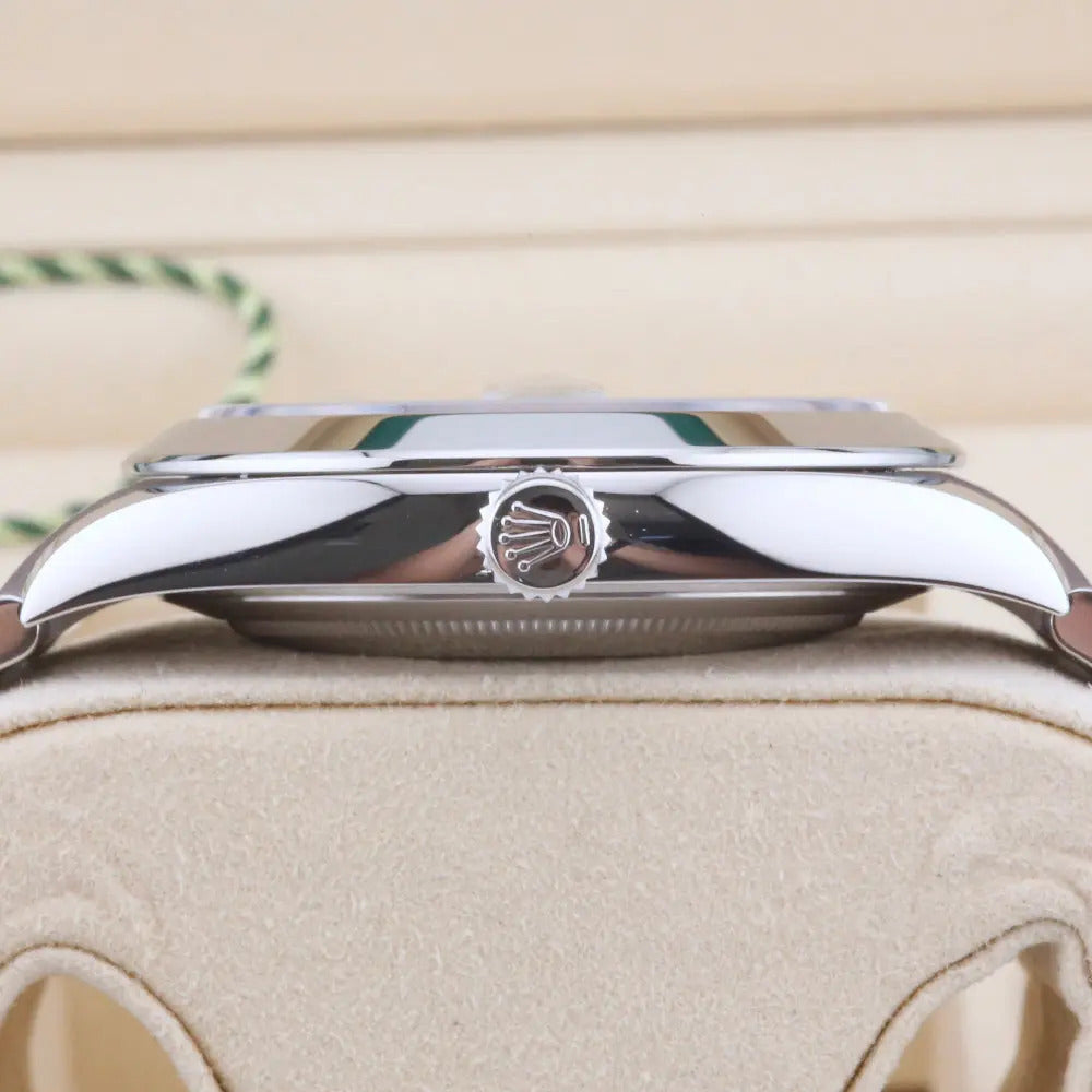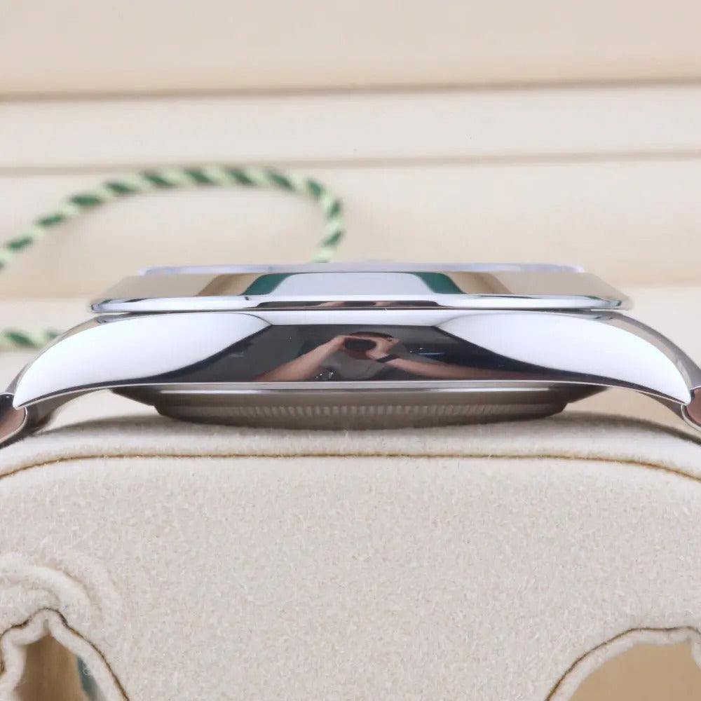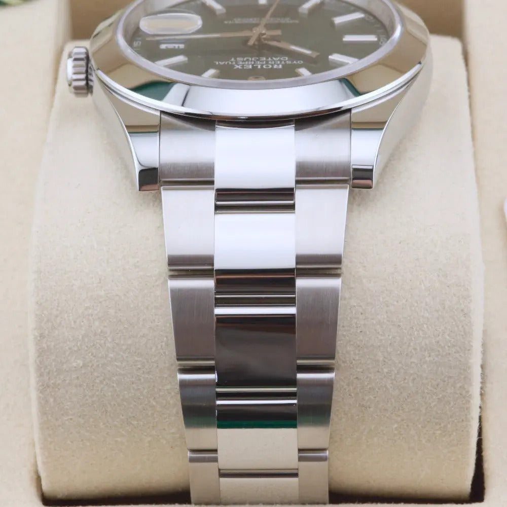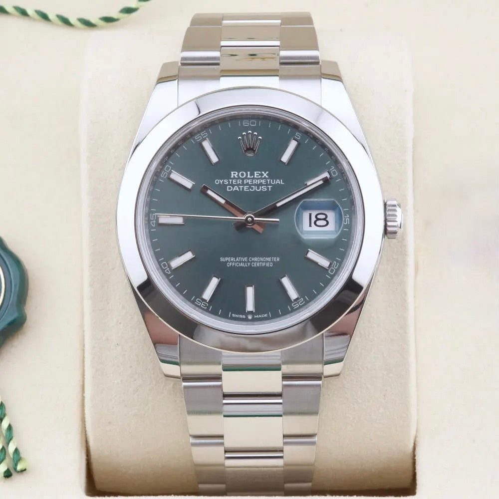 This Rolex Datejust 41 126300 we present today features the sought-after mint green dial with luminescent baton hour markers allowing for swift legibility. In addition, the watch comes with Rolex's latest and most sophisticated time and date movement, a modern oyster bracelet, and a smooth bezel.