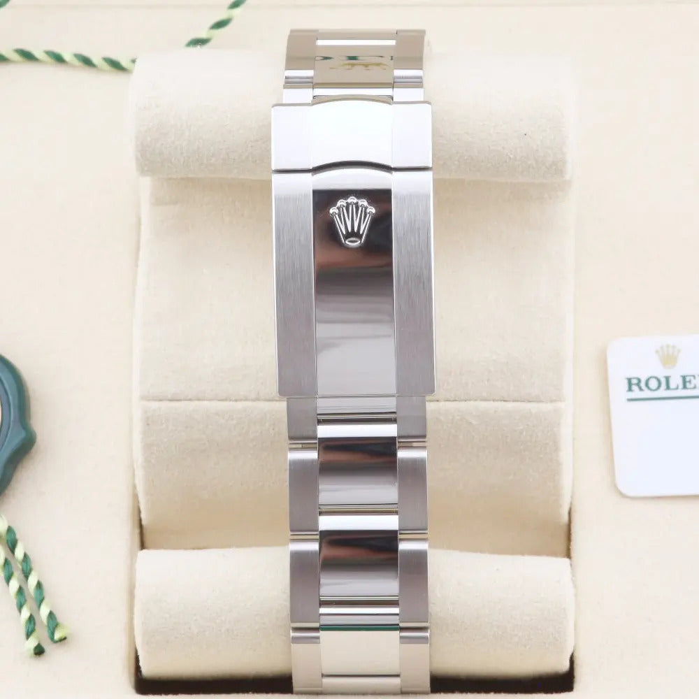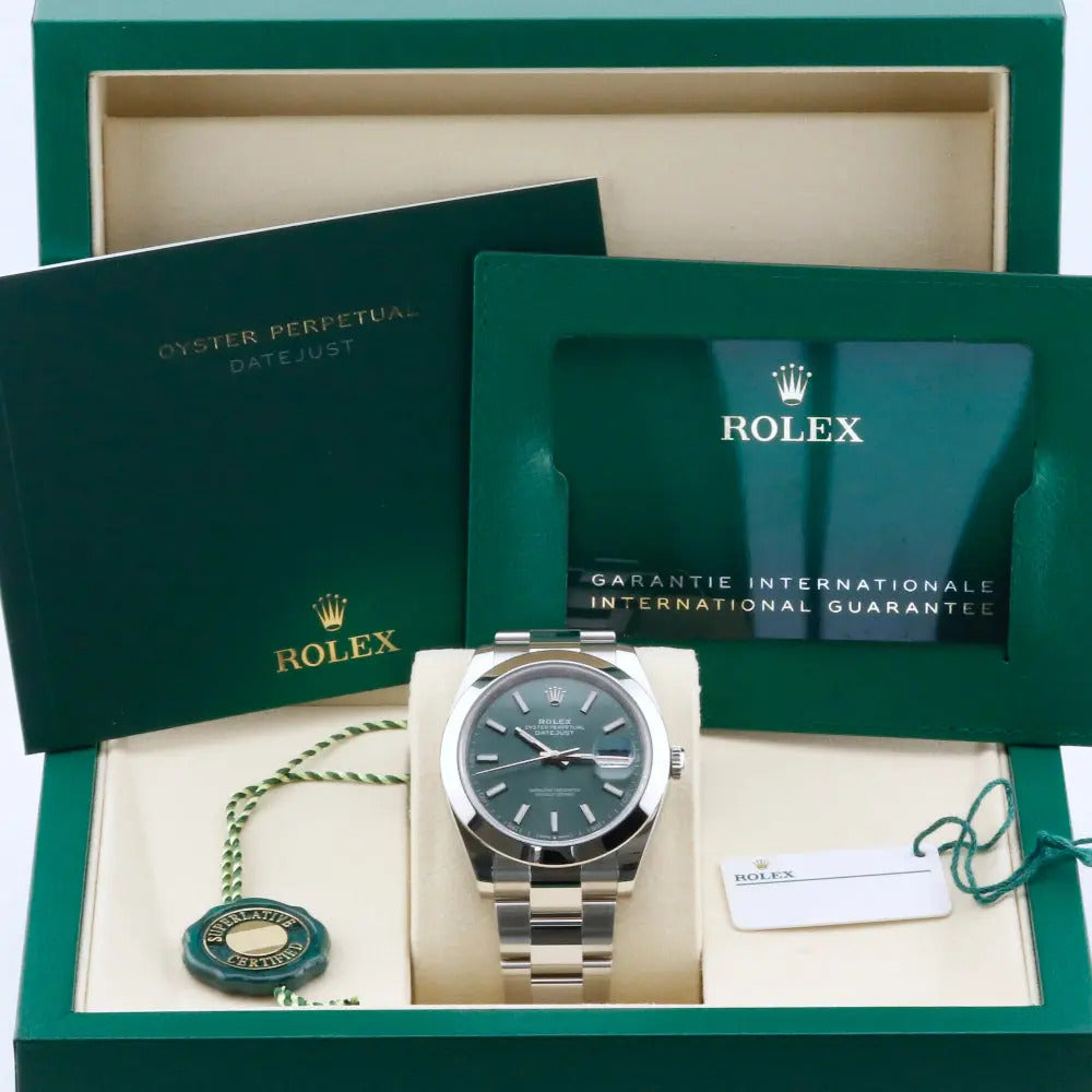 This unworn 2023 Rolex Datejust 41 Mint Green Dial 126300 is sold as a complete and original set, including the original box, papers and booklets. A watch register certificate and the remainder of the manufacturer's warranty are also included.