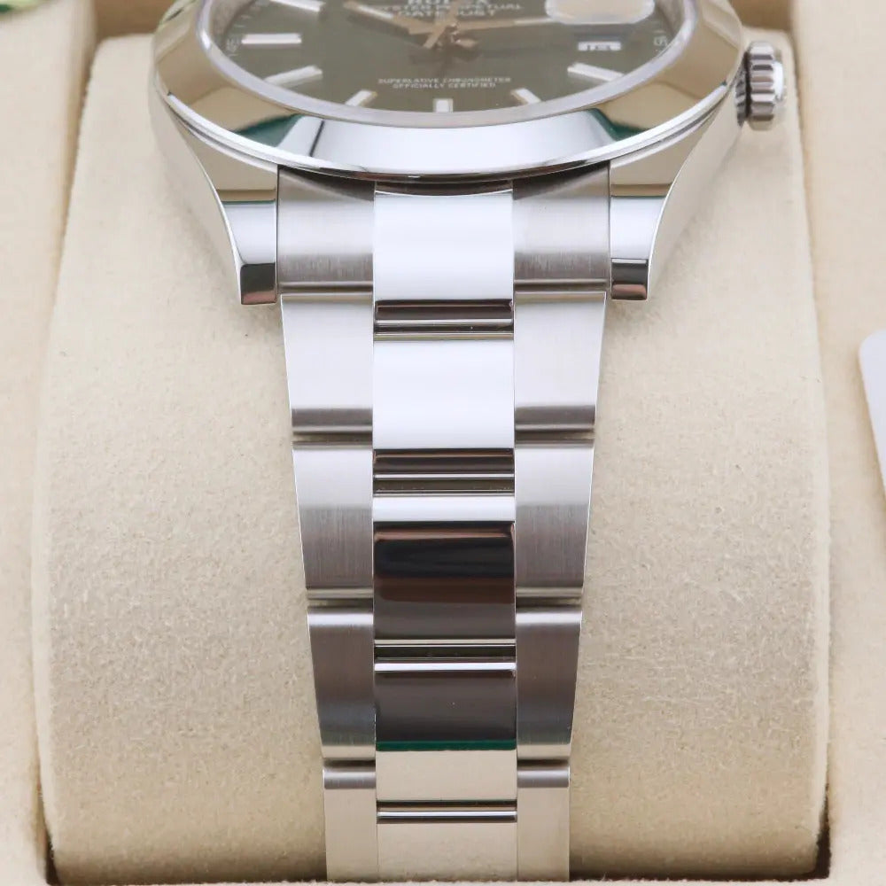 This Rolex Datejust 41 126300 we present today features the sought-after mint green dial with luminescent baton hour markers allowing for swift legibility. In addition, the watch comes with Rolex's latest and most sophisticated time and date movement, a modern oyster bracelet, and a smooth bezel.