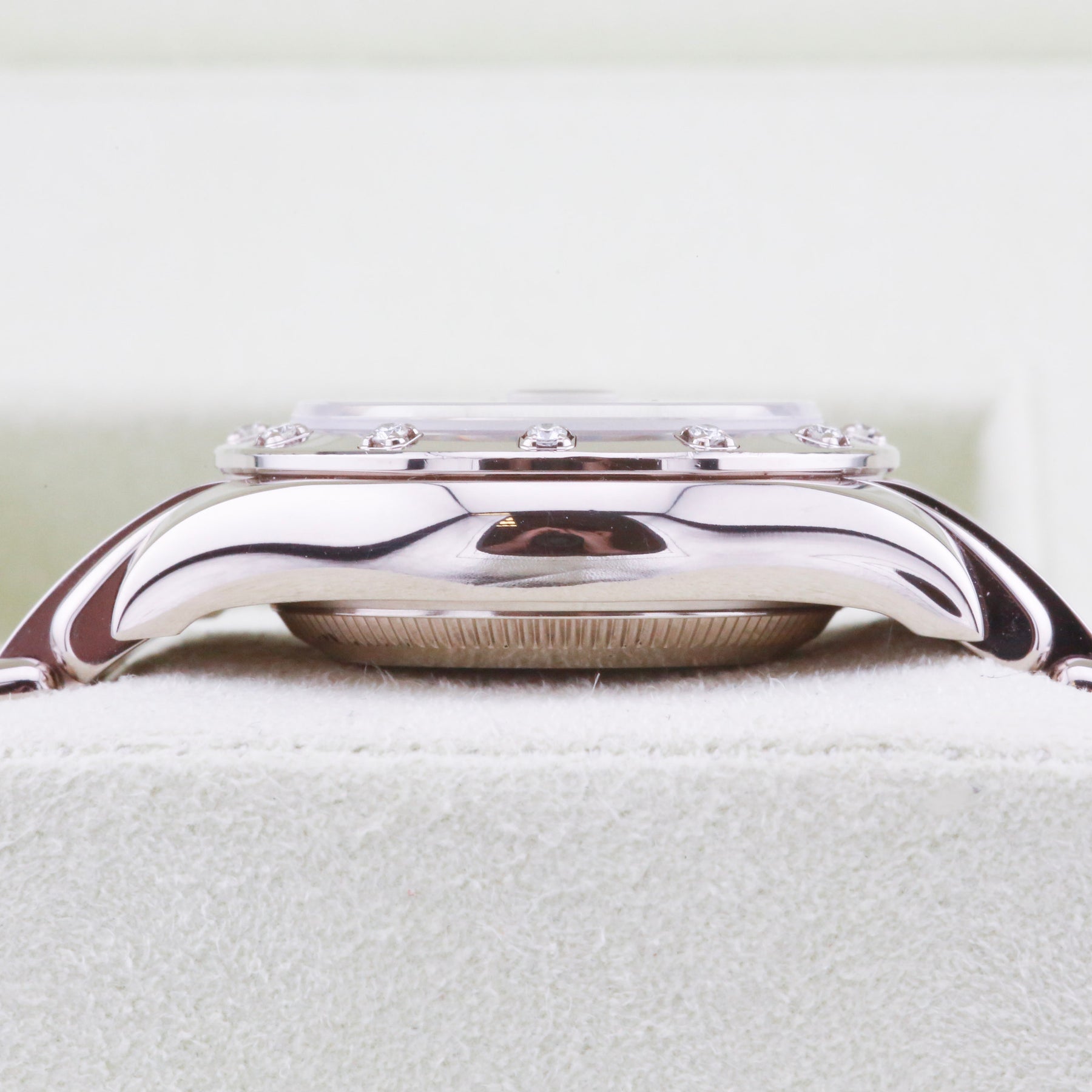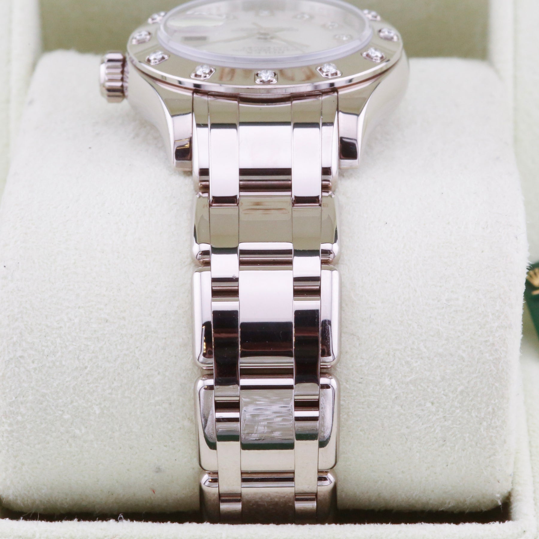 The Rolex Pearlmaster 80319 is crafted entirely from 18ct white gold and features a unique and elegant Pearlmaster case and bracelet. Its rounded, polished links and gem-set bezel give the watch a softer, more jewellery-like feel on the wrist.