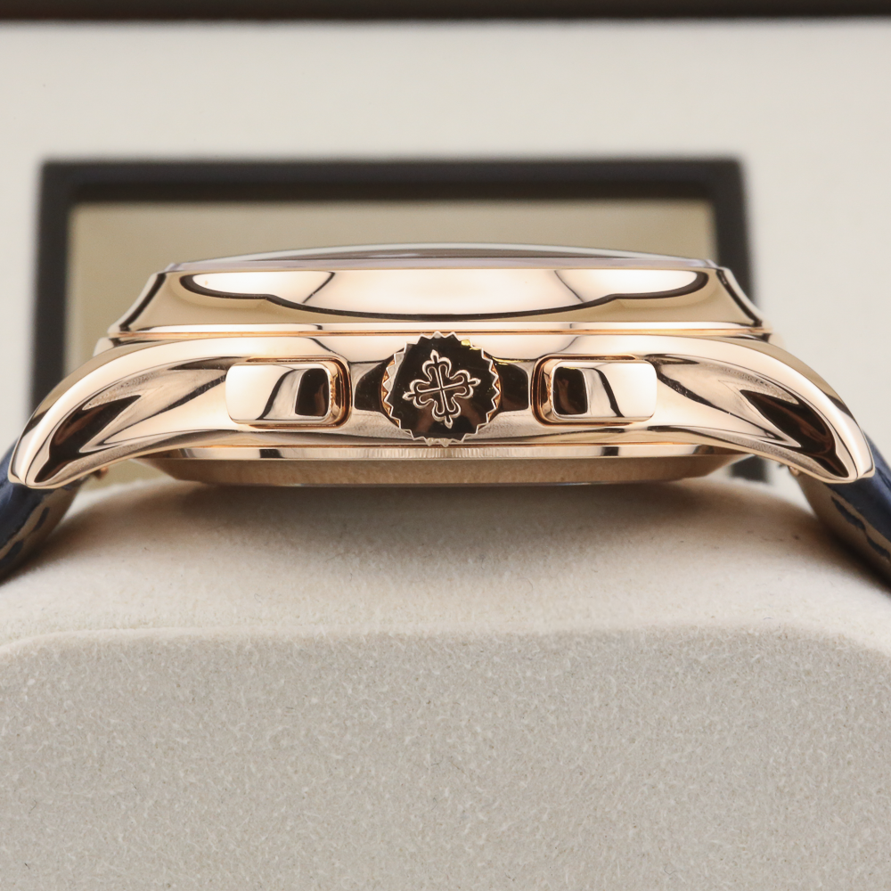 This Patek Philippe Complications 5905R-010 Blue Dial is available to purchase from our London showroom. It boasts a stunning blue sunburst dial, gold-applied hour markers, and a transparent sapphire crystal case back that allows calibre CH 28-520 QA 24H to be admired. This self-winding flyback chronograph features Patek Philippe's patented annual calendar feature, which only requires one adjustment each year on March 1st.