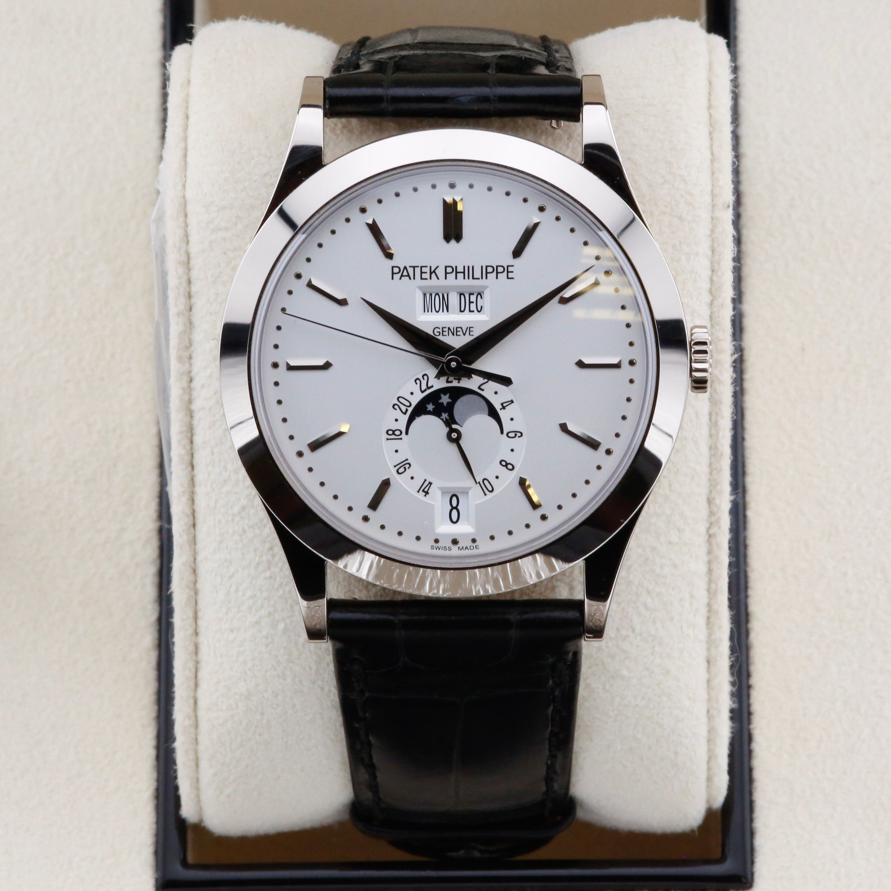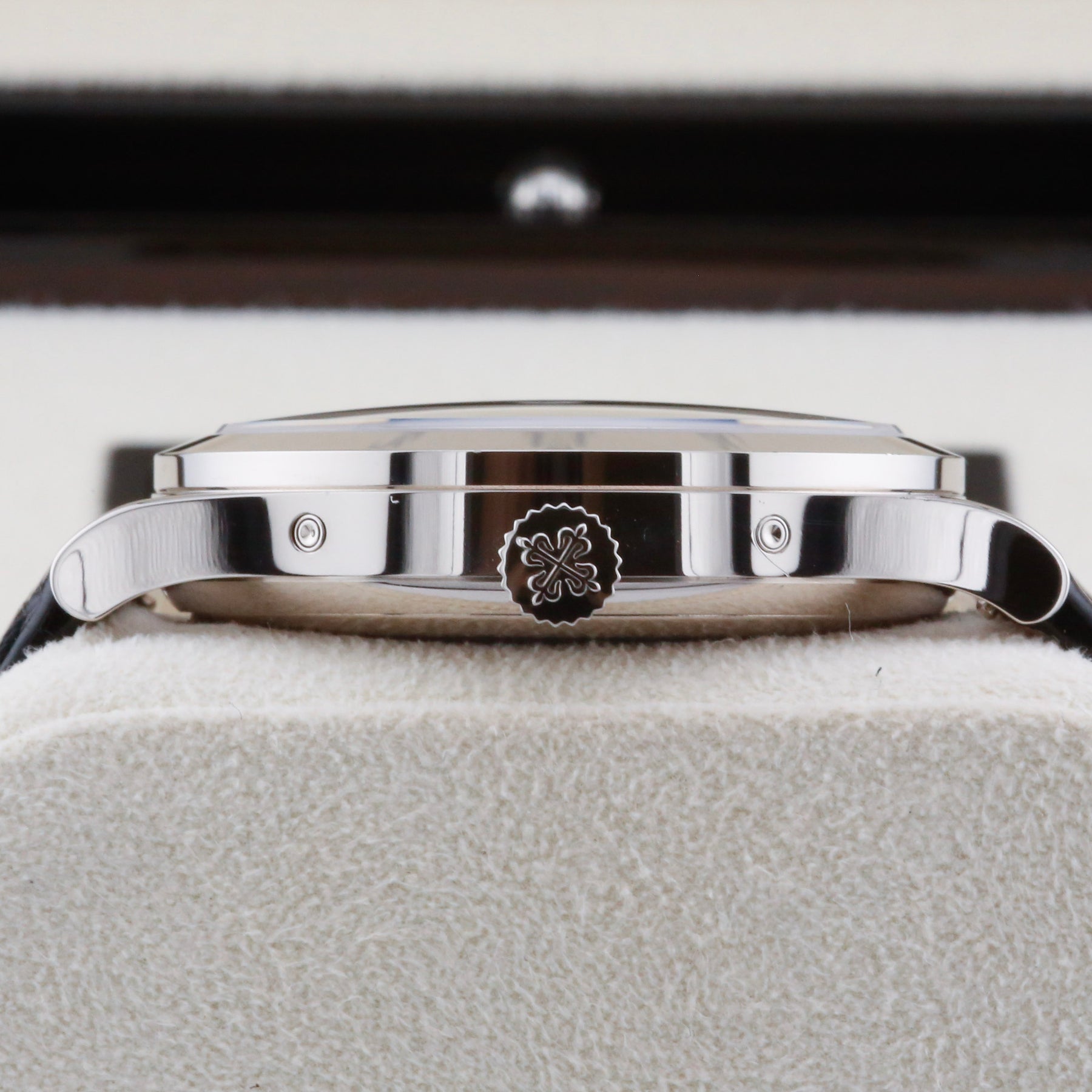 This Patek Philippe 5396G-011 white dial is in stock and available at our London showroom. The watch is a refined take on the classic annual calendar dress watch. Crafted in 18ct white gold, the 38.5mm case is paired with a now-discontinued white dial featuring day, date and month in framed apertures, together with a moonphase display and 24-hour indication. The clean layout, applied baton hour markers and slender hands give the watch a balanced and timeless look, while the automatic movement inside delivers the precision and practicality expected from a modern Patek Philippe complication.