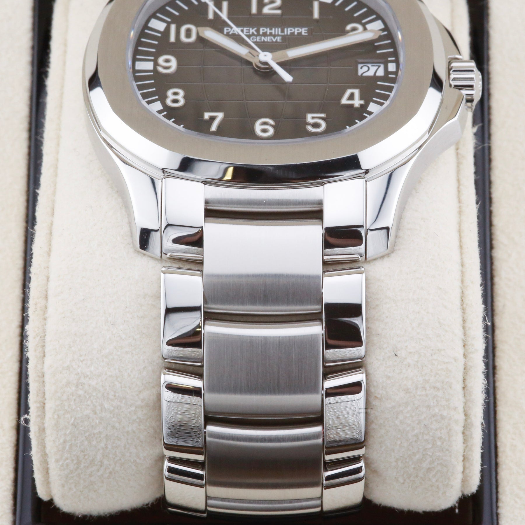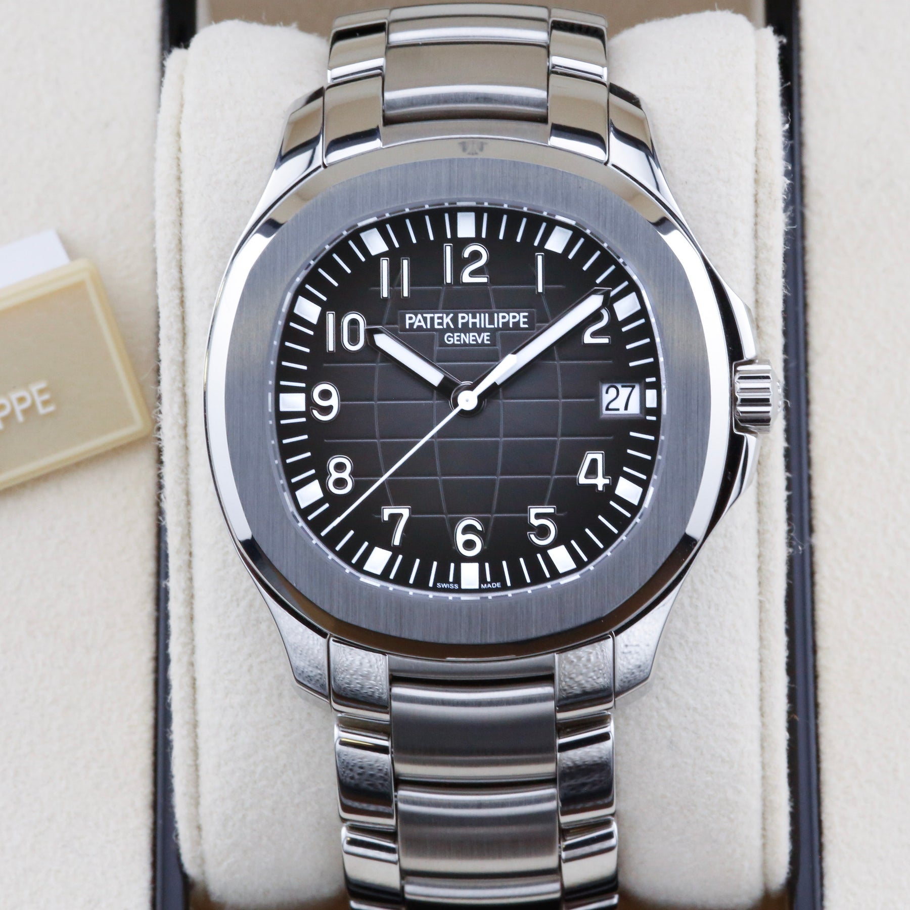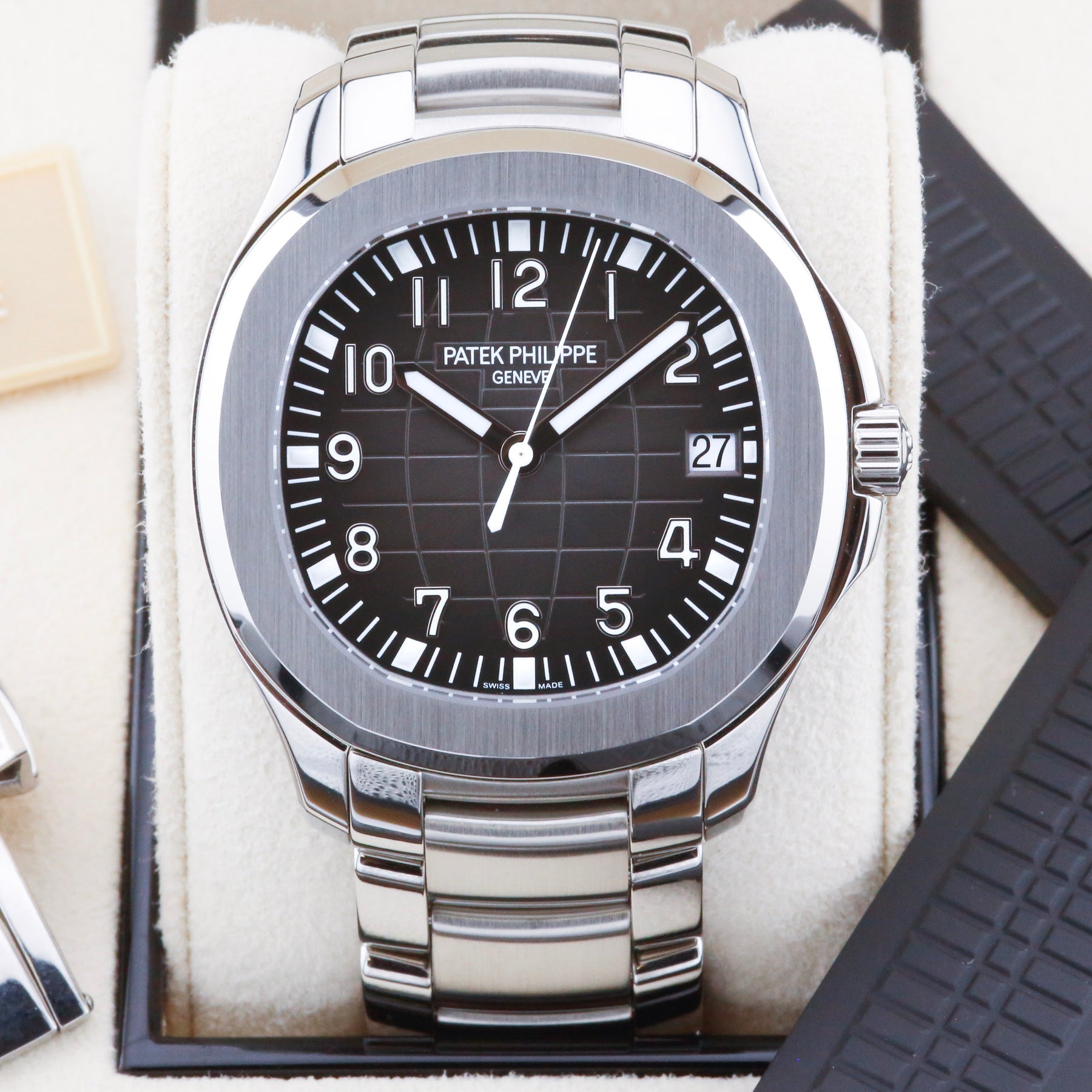 This Patek Philippe Aquanaut 5167/1A is available at our London showroom. The watch features an embossed black dial, stainless steel case and stainless steel strap and an additional a tropical black strap.