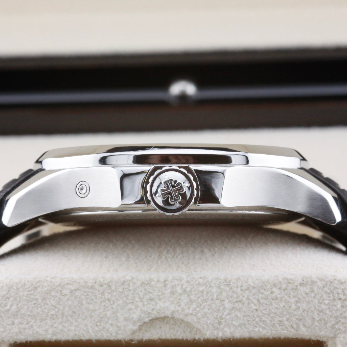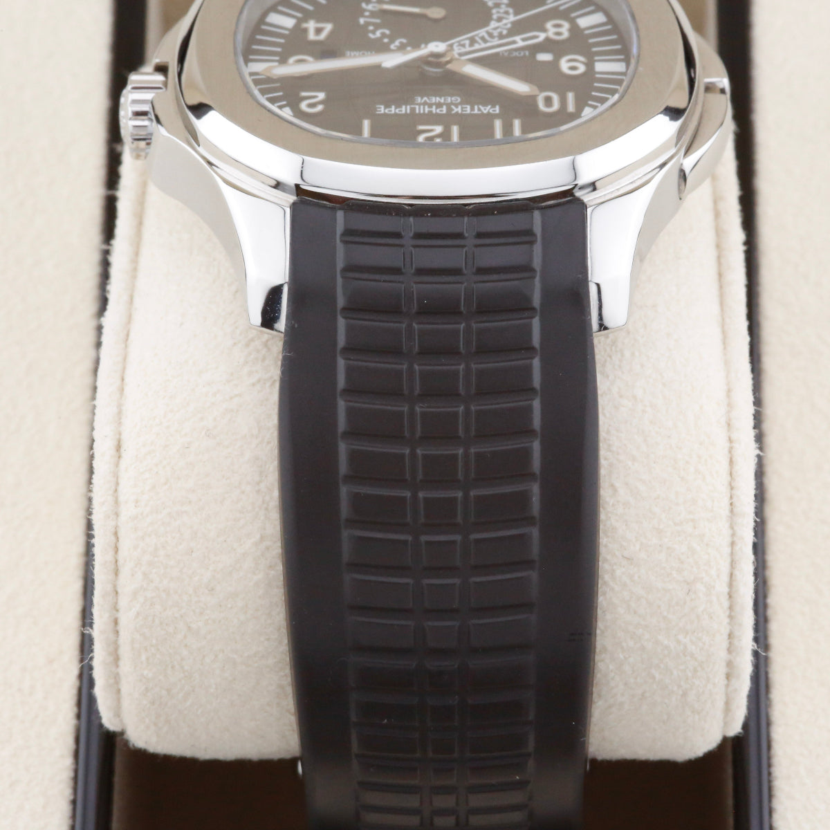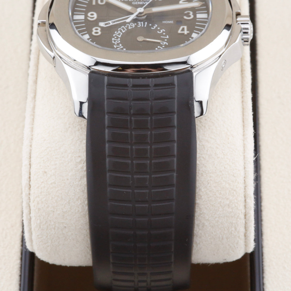 This Patek Philippe Aquanaut 5164A Travel Time is available at showroom in London. housed in the contemporary Aquanaut case. Crafted in stainless steel with a 40.8mm rounded octagonal case, it features the embossed black-brown dial, applied Arabic numerals and luminous hands. The “tropical” strap completes the look, offering excellent comfort and durability.