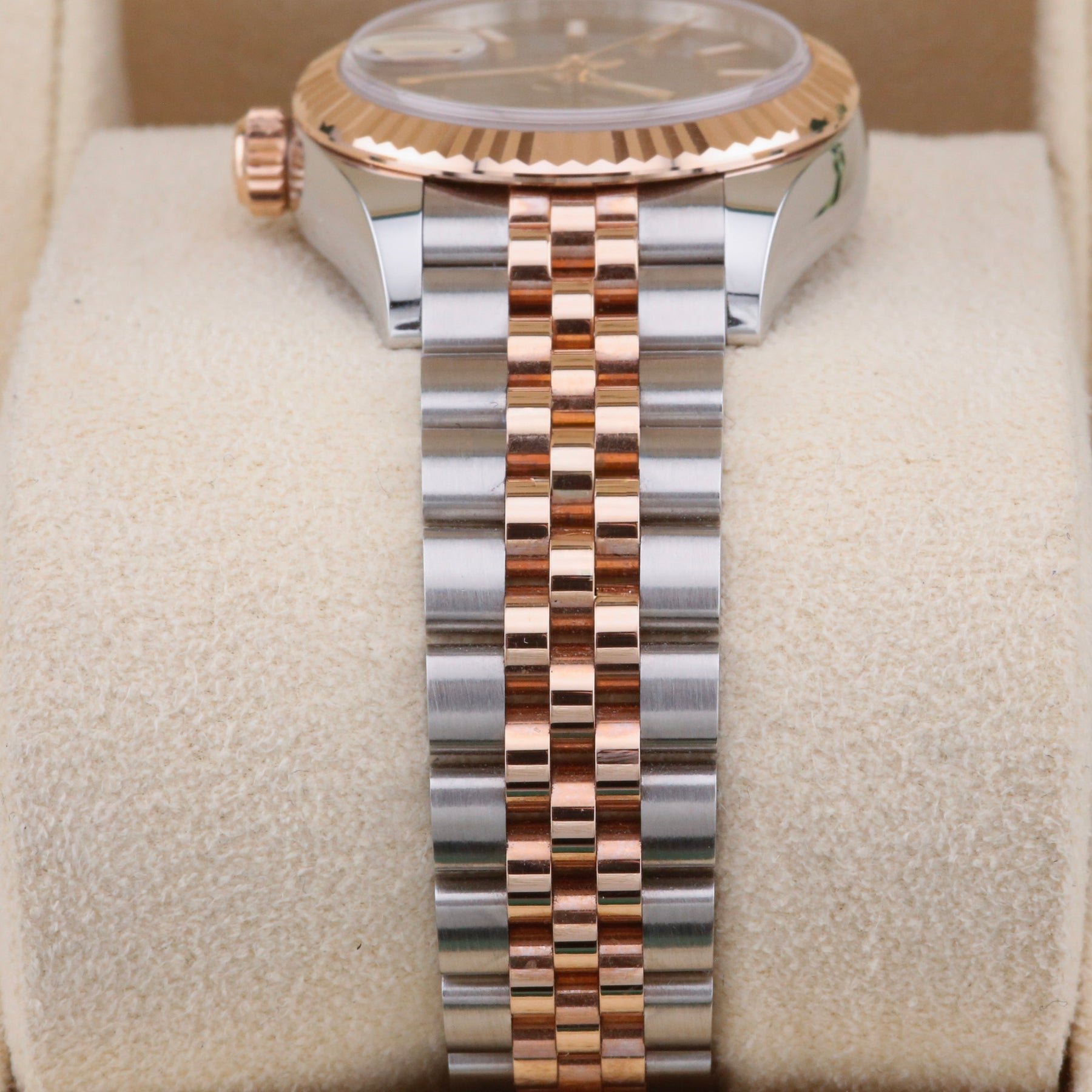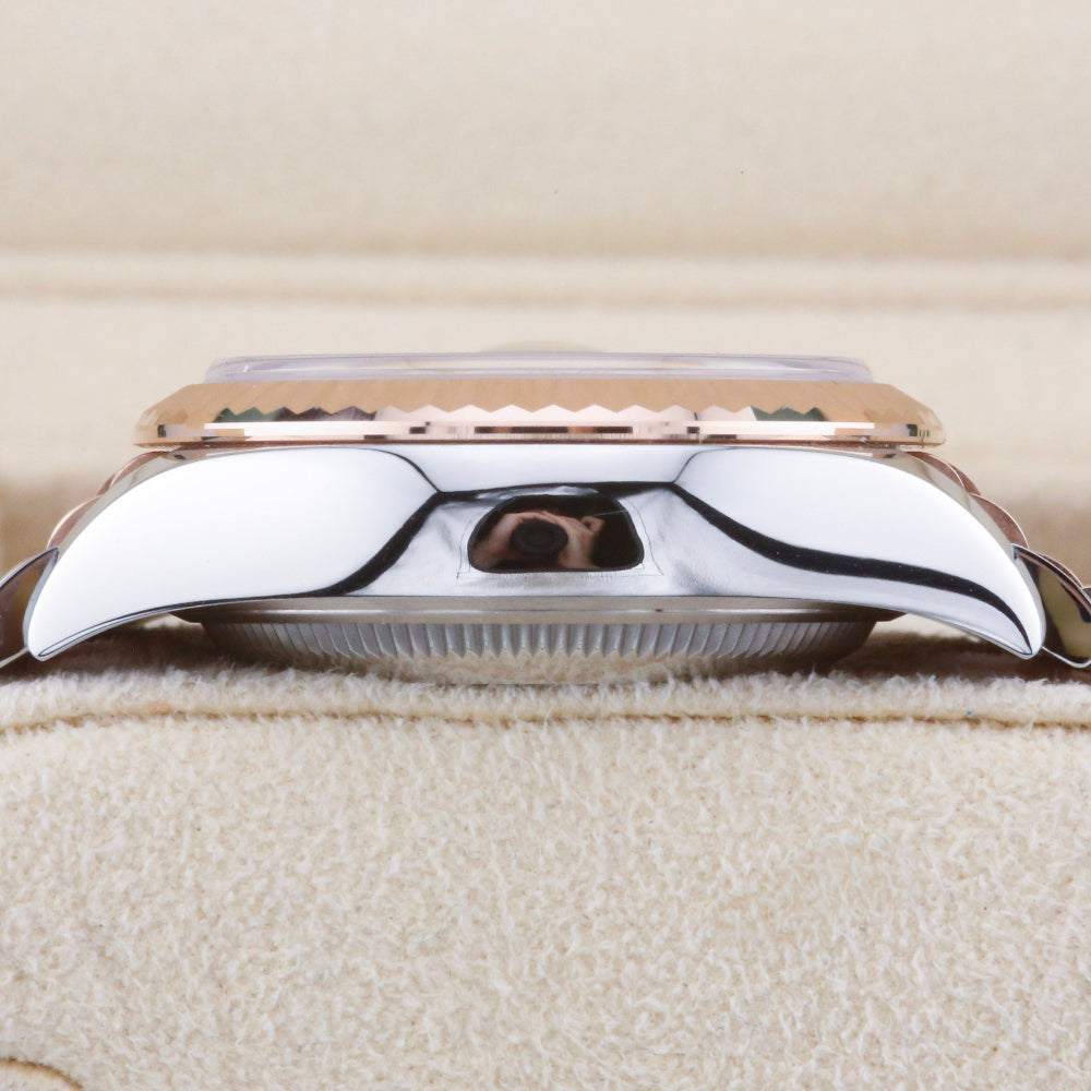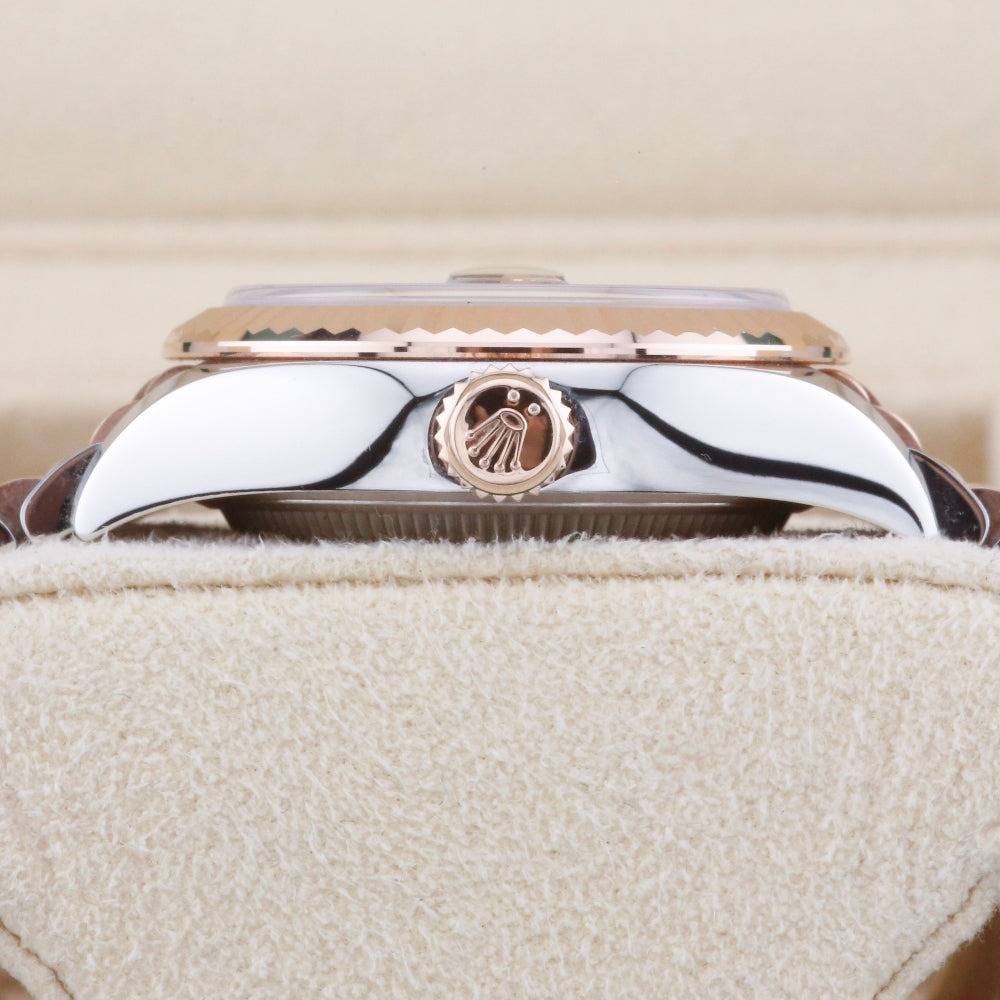 This Rolex Datejust 28 Chocolate Dial 279171 is available at the showroom in London. The watch features an 18ct Everose gold fluted bezel, a bi-metal jubilee bracelet with a concealed clasp, and a sought-after chocolate sunburst dial. The watch is sold as a complete set, including the original box, papers, and booklets. A watch register certificate and a 12-month warranty are also included.
