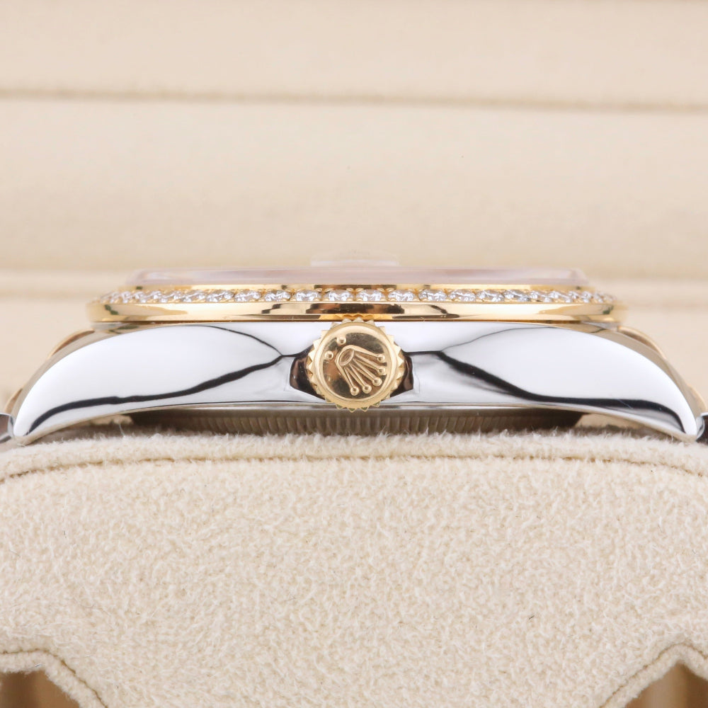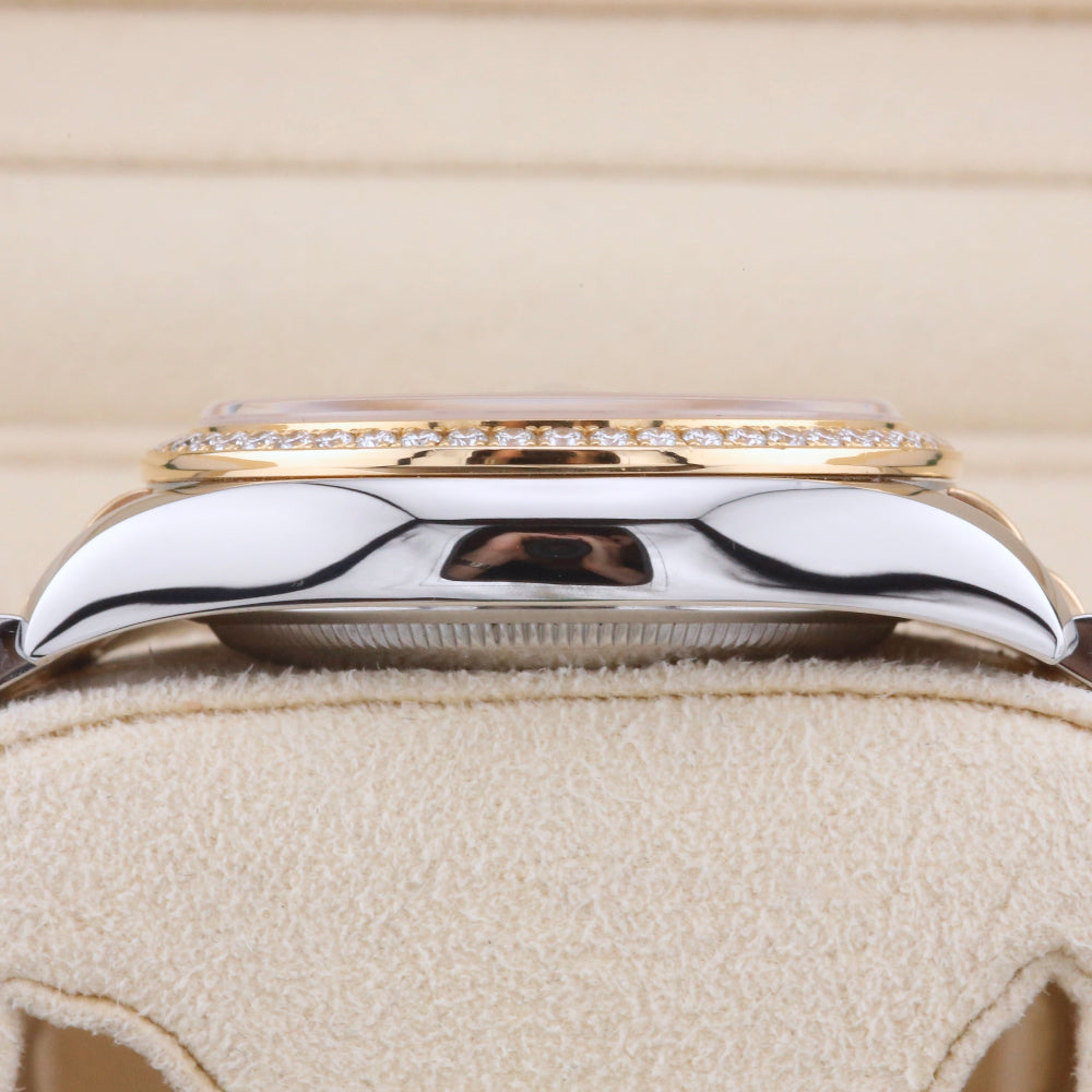 This Rolex Datejust 36 Champagne Diamond Bezel 116243 is available at our showroom in London. The watch boasts a classic bi-metal configuration that features a super jubilee (concealed clasp) bracelet and diamond-set bezel. The highlight of this watch is the rare diamond-set bezel.