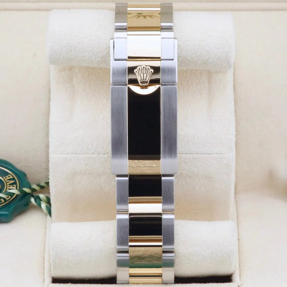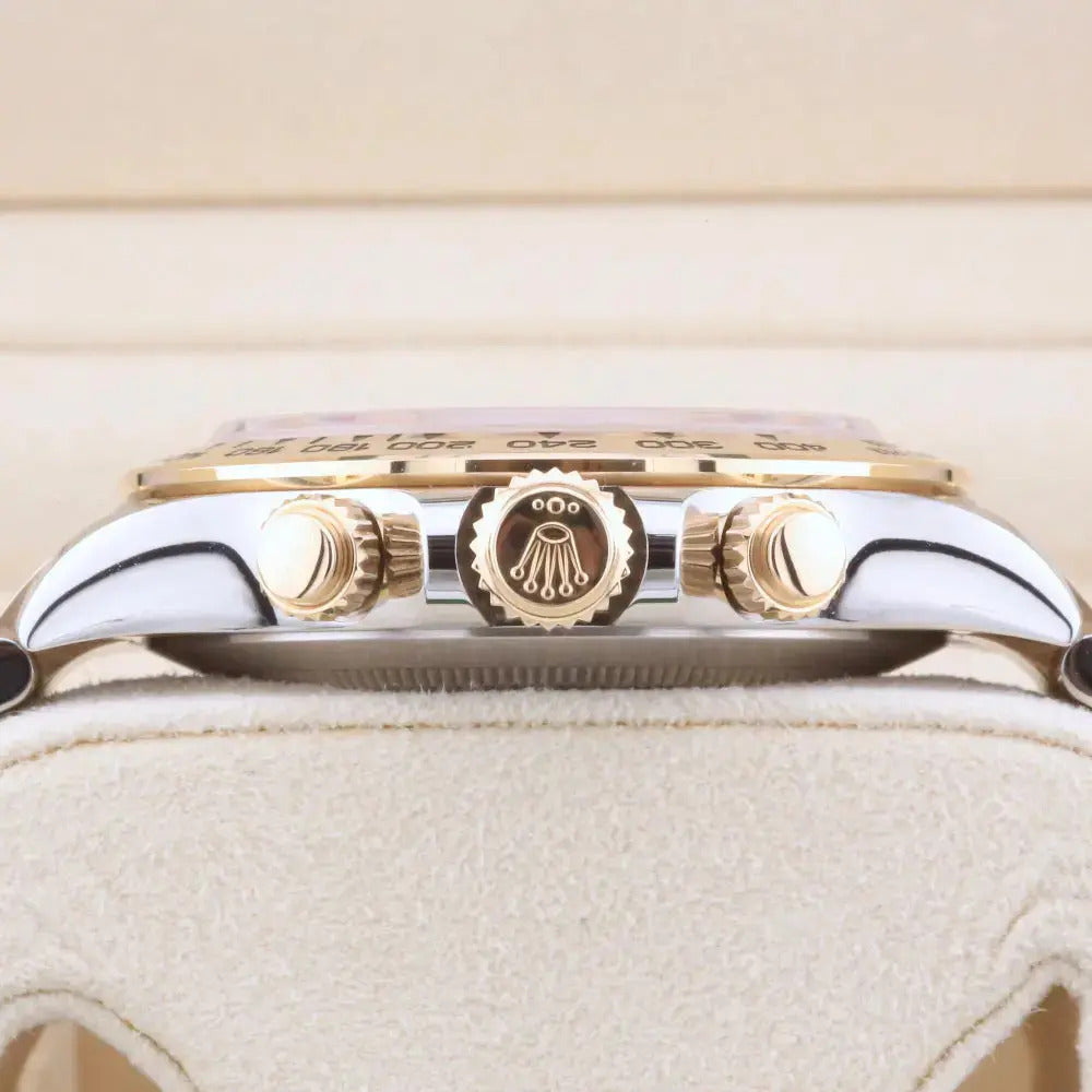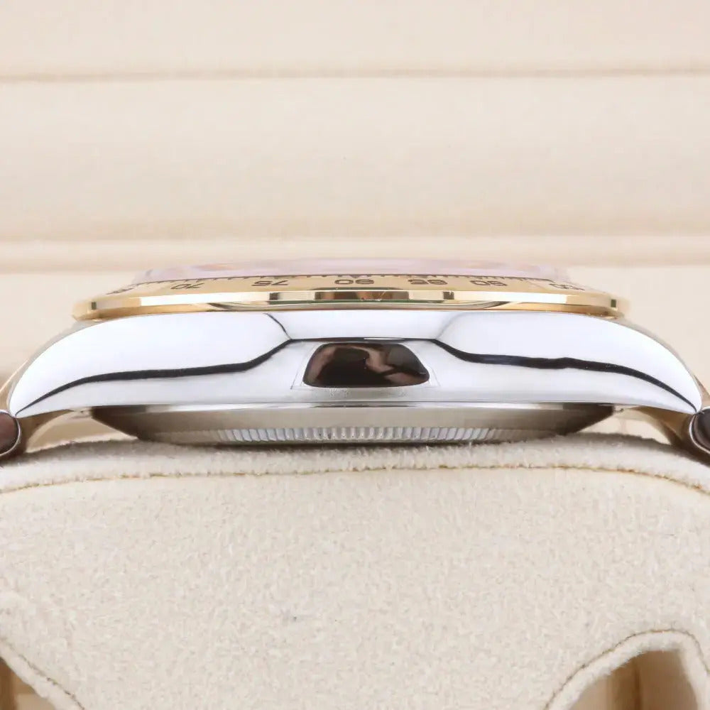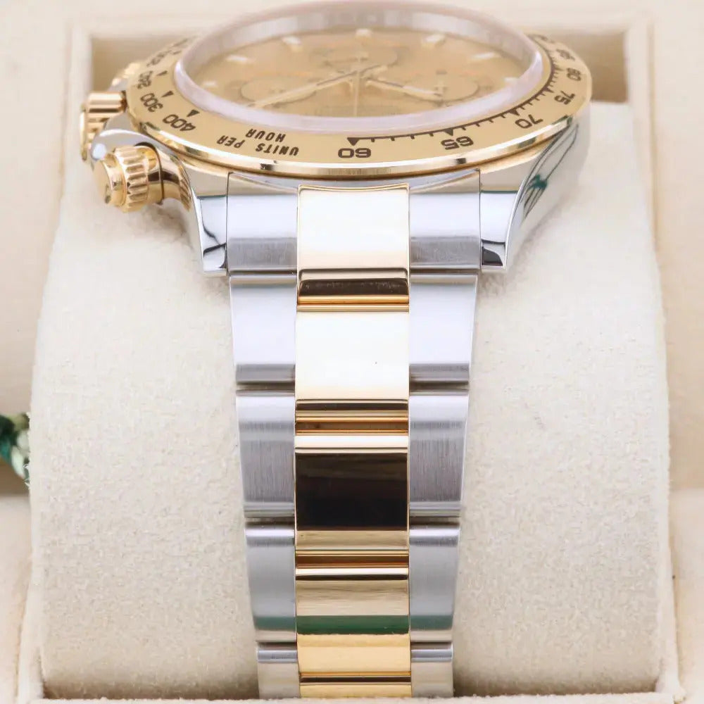 This 2020 Rolex Daytona features an elegant combination of yellow gold and oyster steel. The bi-metal design pairs perfectly with a stunning champagne dial with yellow gold sub-dials, hands and hour markers.