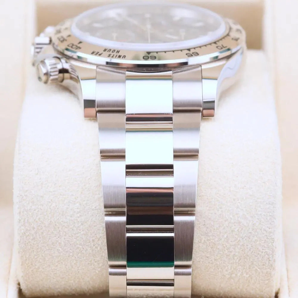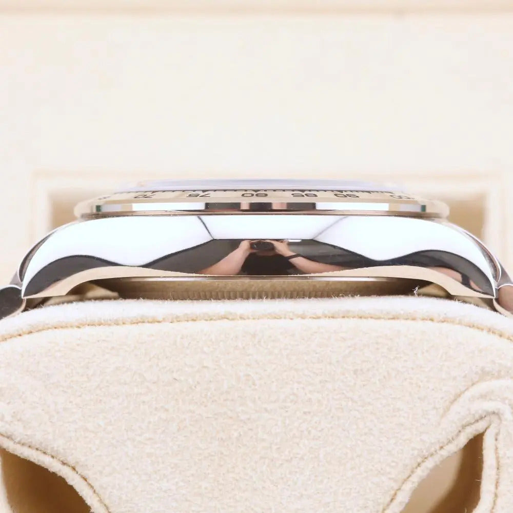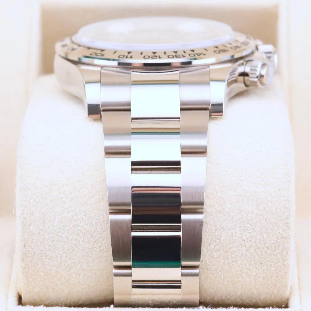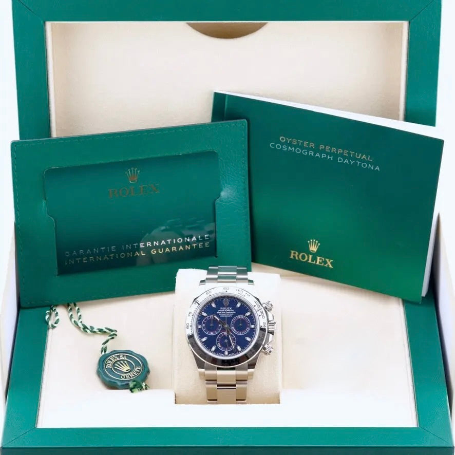 This Rolex Daytona Blue Dial 116509 is dated October 2023. The model was discontinued in the first half of 2023 which makes this blue dial Daytona one of the last to be sold. This Daytona 116509 blue dial is made form 18ct white gold which gives it that luxury, heavyweight feeling. The Daytona is unworn and sold with box and papers. A watch register certificate and the remainder of the manufacturer’s warranty are also included.