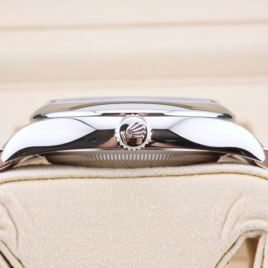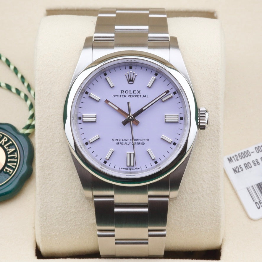 This Rolex Oyster Perpetual 36 Lavender Dial 126000 is in stock and available at our showroom in London. The Lavender dial was released in 2025, along with a variety of other pastel-coloured dials, which have all seen fantastic demand as they are released into the market. This particular watch is unworn and sold as a complete and original set, including the original box, papers, swing tags and booklets. The watch also benefits from a watch register certificate and a manufacturer's warranty until 2030.