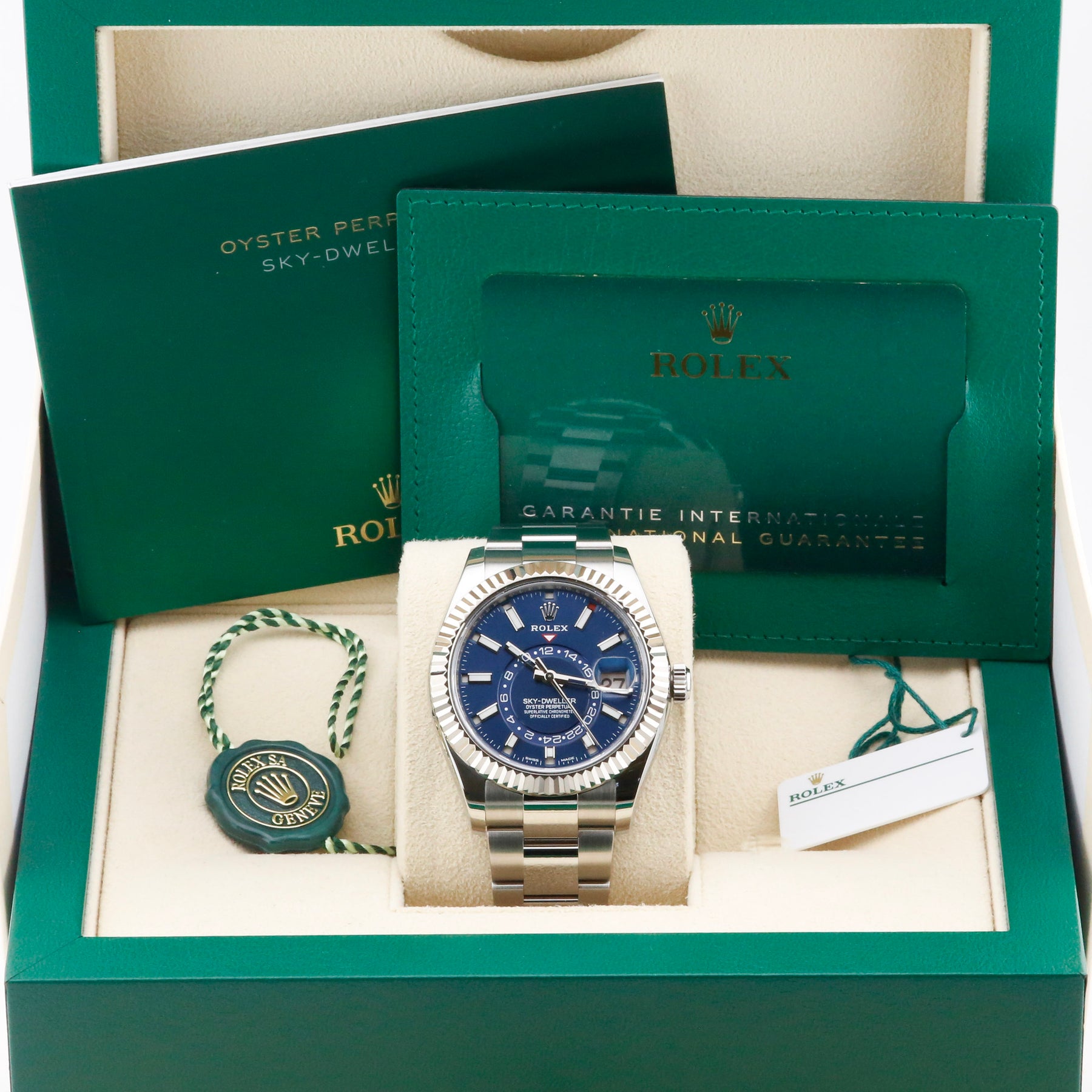 This Rolex Sky-Dweller 326934 blue dial is available at our showroom in London. The watch features an oyster bracelet and a blue sunburst dial that pairs perfectly with the complications and red accents. This watch is unworn with some stickers still attached. The watch is sold as a complete set including the original box, papers, booklets and swing tags. A watch register certificate and the remainder of the manufacturer's five-year warranty are also included.