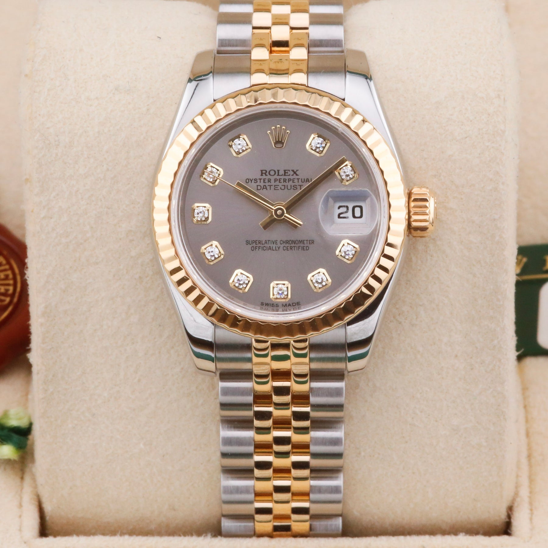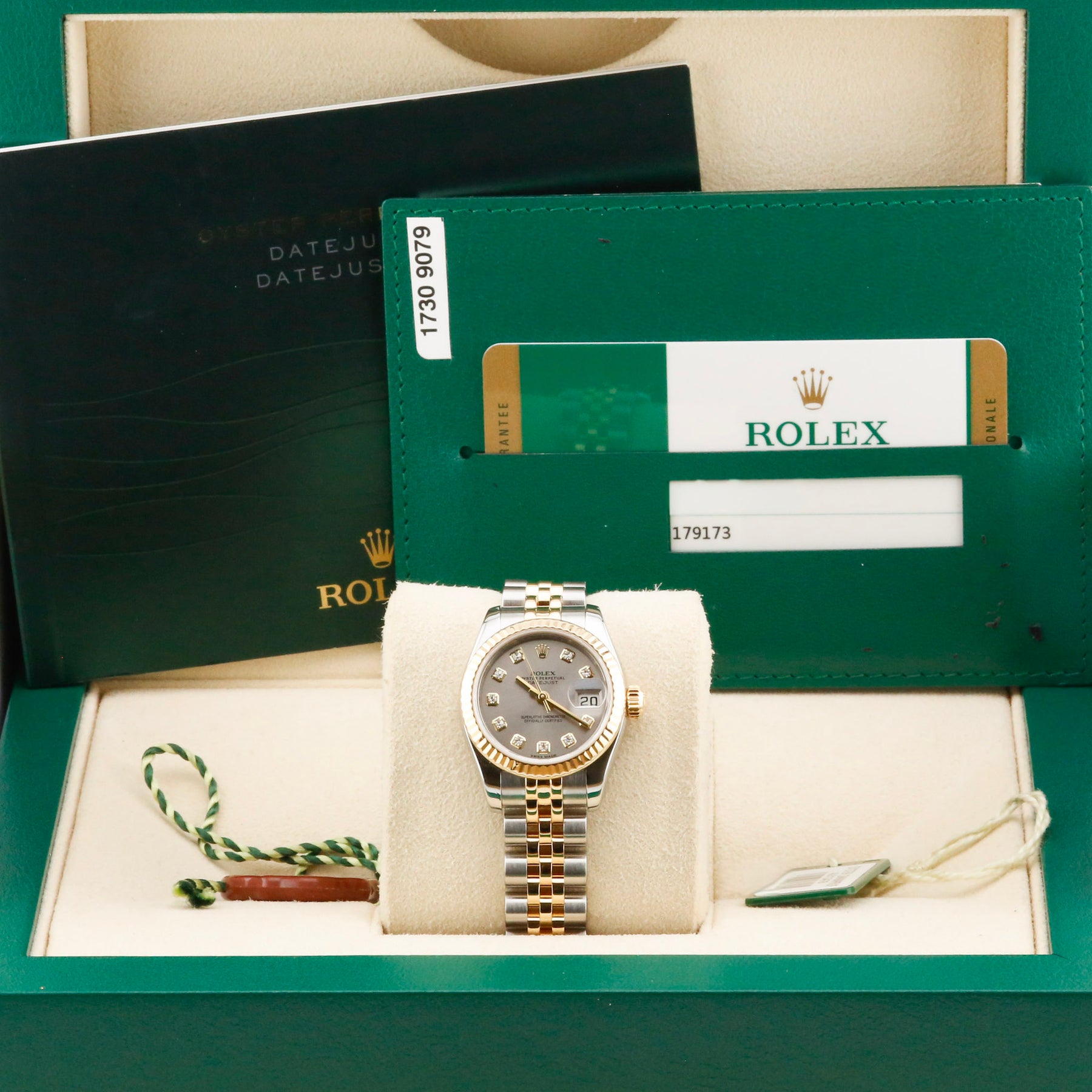 This Rolex Datejust 26 179173 grey Diamond Dial is unworn and sold with box and papers, a watch registry certificate, and a 12-month warranty.