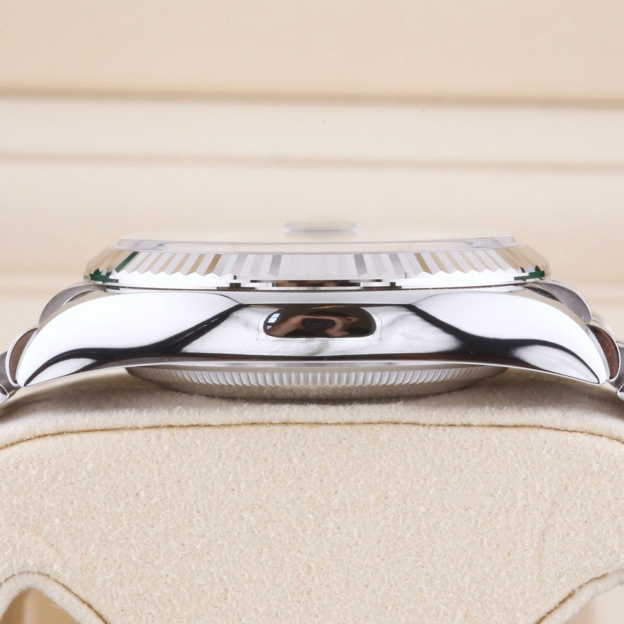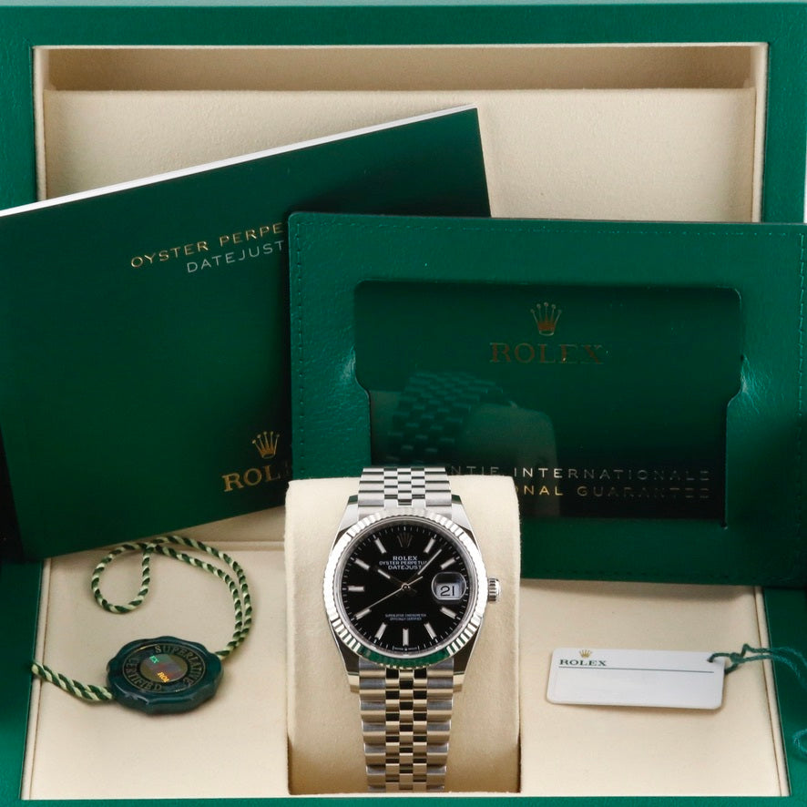 This Rolex Datejust 36 Black Dial 126234 is in stock and available at our showroom in London. The watch features the popular white gold fluted bezel, a 5-link stainless steel Jubilee bracelet and a black sunburst dial. The watch is a 36mm, which is the original size for the Rolex Datejust.