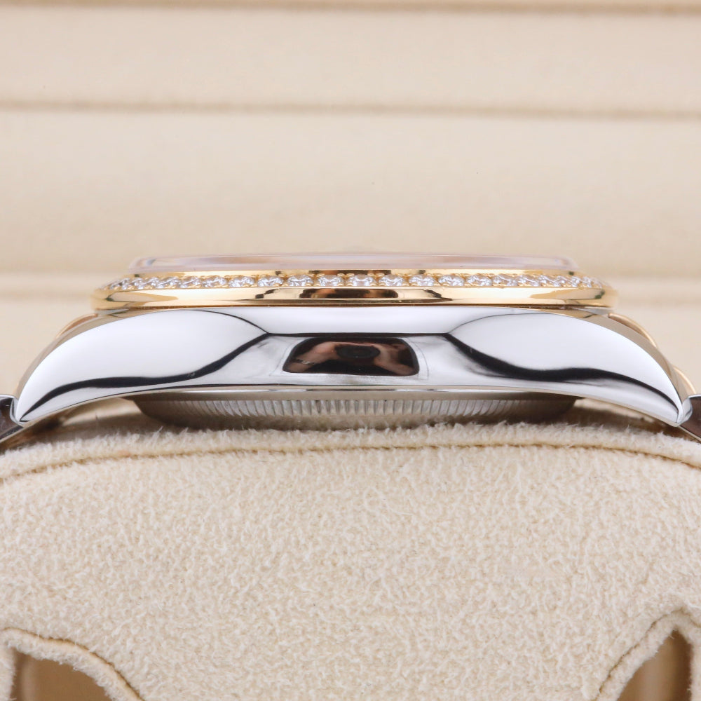 This Rolex Datejust 36 Champagne Diamond Bezel 116243 is available at LBJ Watches London. The watch boasts a classic bi-metal configuration that features a super jubilee (concealed clasp) bracelet and diamond-set bezel. The highlight of this watch is the rare diamond-set bezel.