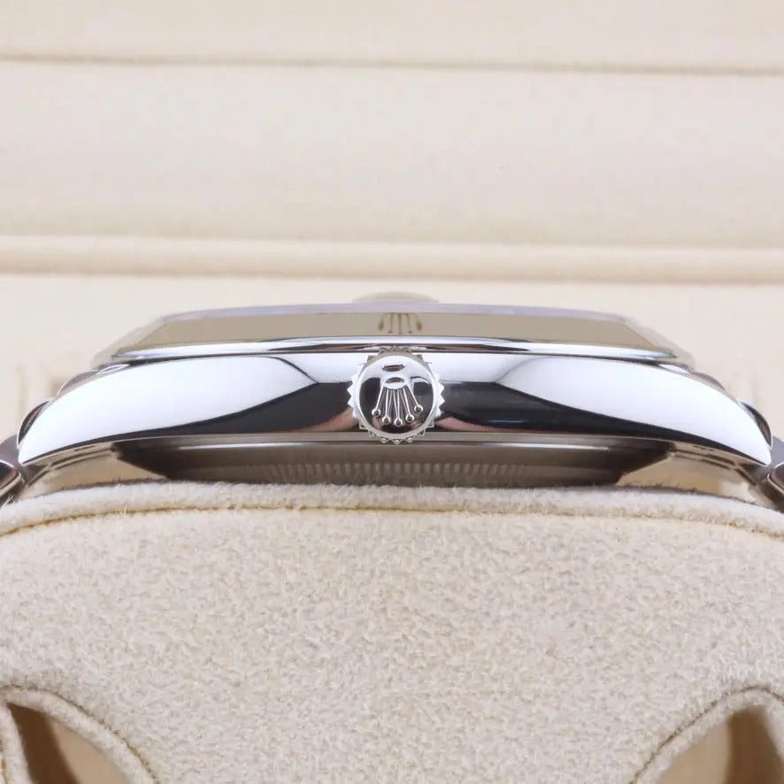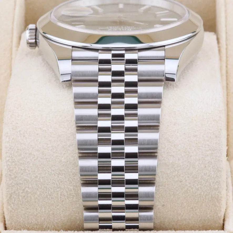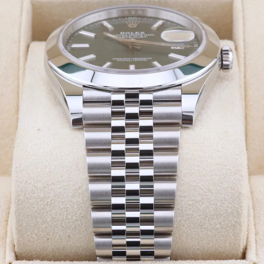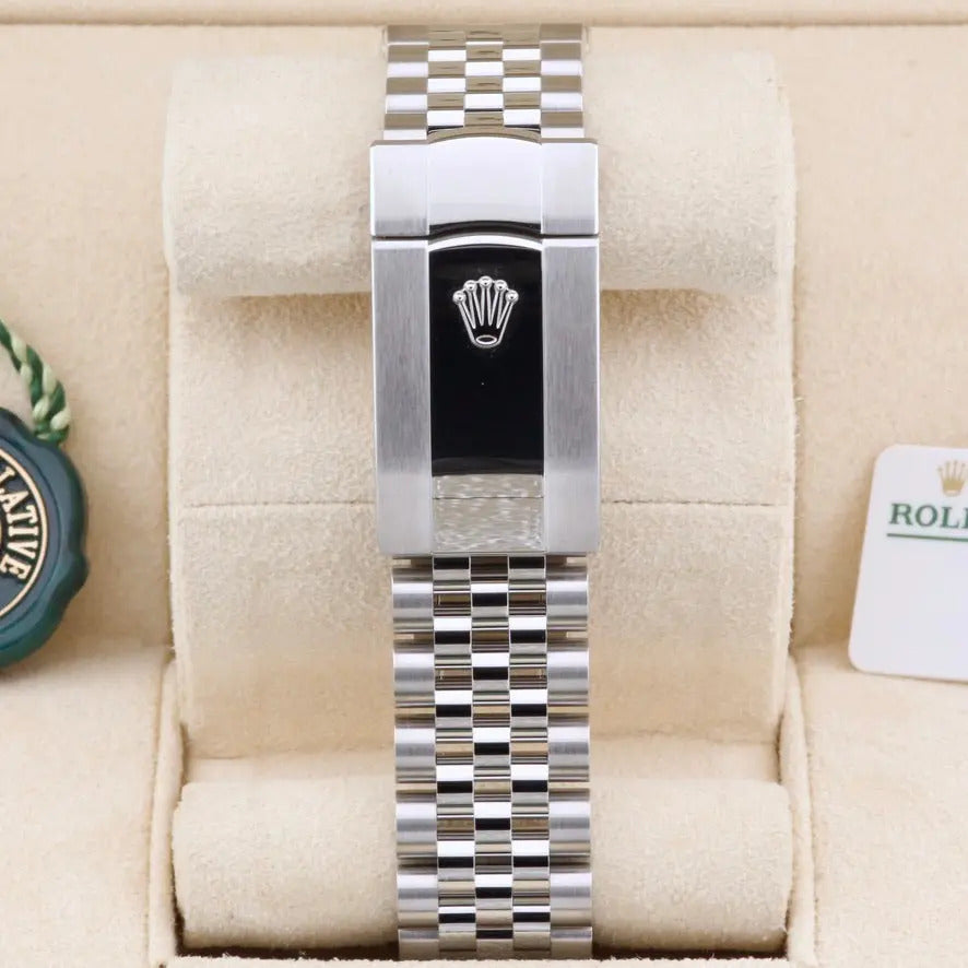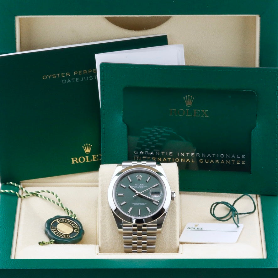 This unworn 2025 Rolex Datejust 41 Mint Green Dial 126300 is sold as a complete and original set, including the original box, papers, booklets, swing tags and even the original receipt . A watch register certificate and the remainder of the manufacturer's warranty are also included.