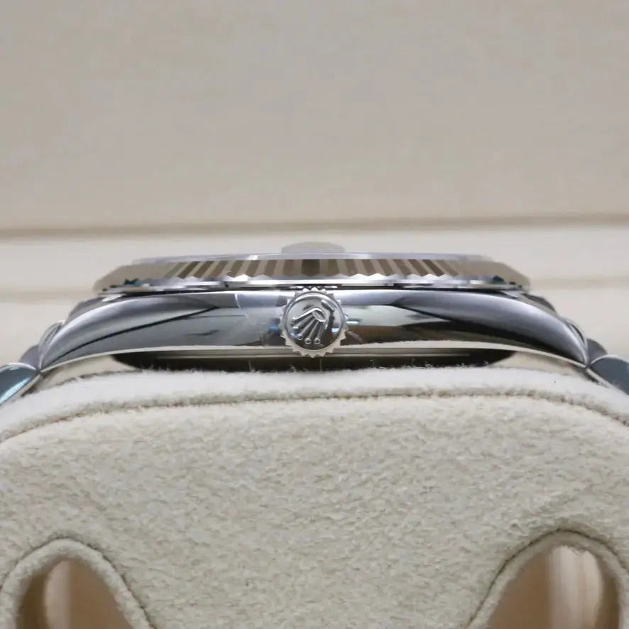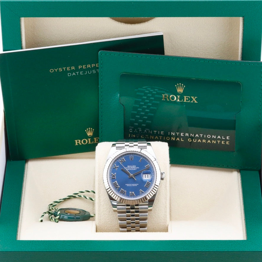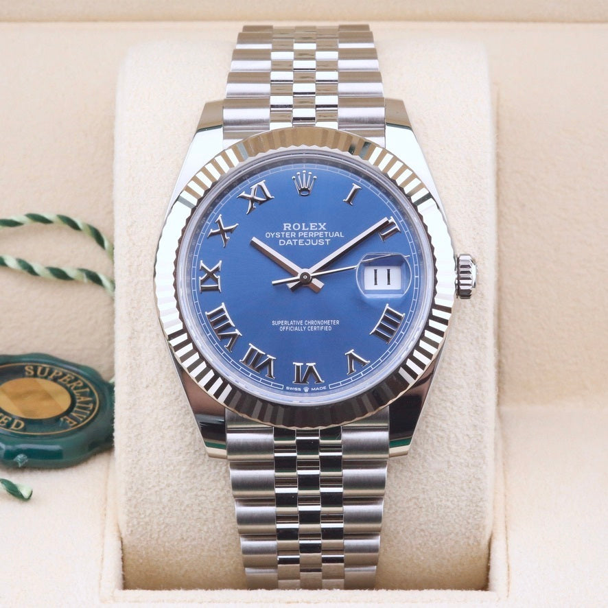 This Rolex Datejust 41 Blue Azzurro Dial 126334 is available at our showroom in London. The blue azzurro dial is renowned for its strong sunburst effect. The watch also features an 18ct white gold bezel and jubilee bracelet, which, in our experience, is one of the most sought-after configurations for the Rolex Datejust 41. This particular piece is sold as a complete and original set, including the original box, papers and booklets. A watch register certificate and the remainder of the manufacturer's five-year warranty are also included.