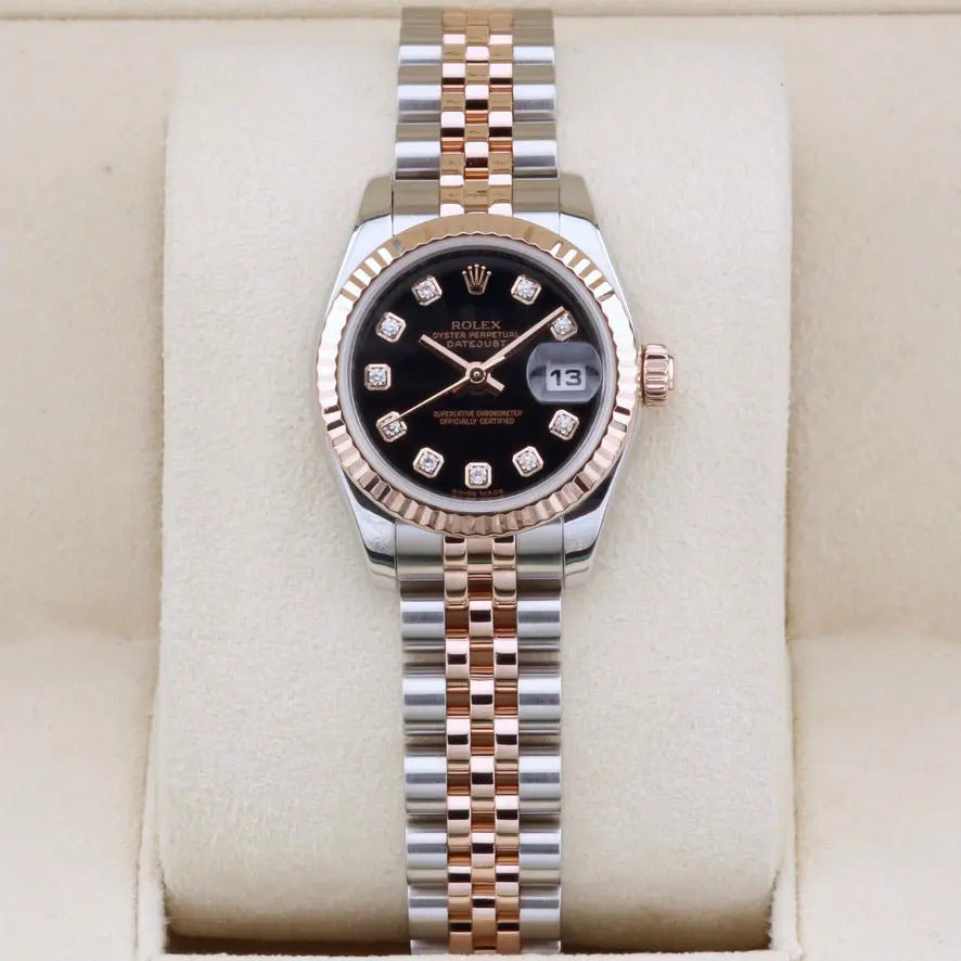 This Rolex Datejust 26 179171 Black Diamond Dial is available at our showroom in London. The watch boasts a classic and popular bi-metal configuration, a jubilee bracelet with a concealed clasp, an Everose gold fluted bezel and a stunning black diamond dial.