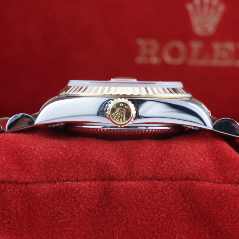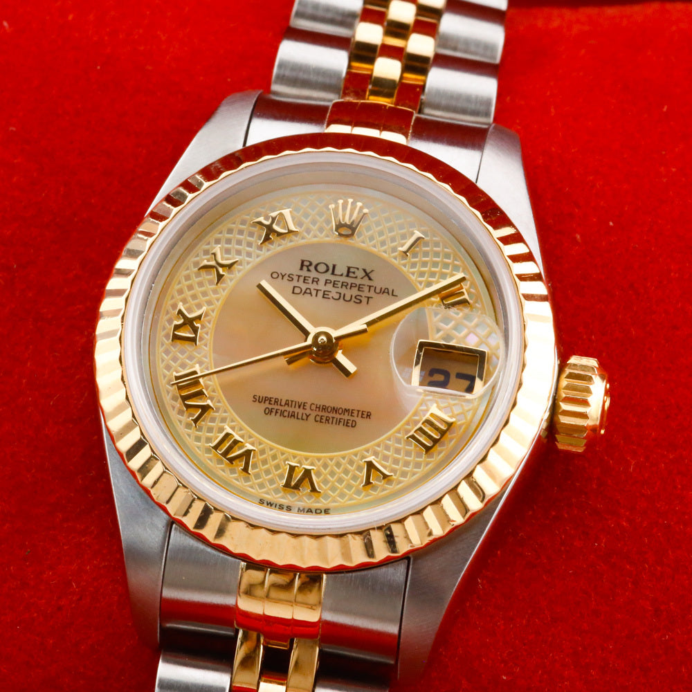 This Rolex Datejust 26 Mother Of Pearl Dial Roman Numeral Dial 79173 is available at our showroom in London. This Datejust has a popular configuration that features a Jubilee bracelet and a fluted bezel, but this watch's main highlight has to be the stunning Mother of Pearl Dial Roman Numeral dial that has to be seen in person to be truly appreciated. It is a fantastic example and a true piece of history, as it is sold as a complete collector's set, including the original box, papers, booklets, and even the original purchase receipt. A watch register certificate and a 12-month warranty are also included.