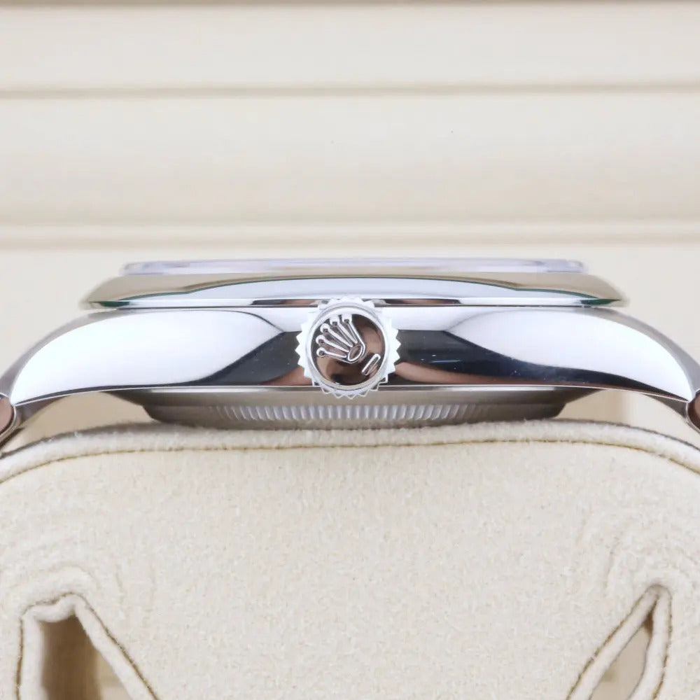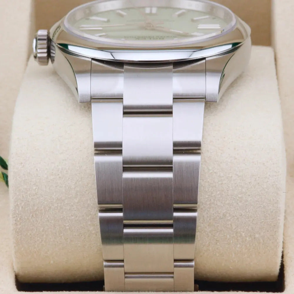 This Rolex Oyster Perpetual 41 134300 Pistachio is available at our showroom in London. The Pistachio dial is one of the newly released watches from Rolex in 2025, a part of a new pastel collection. The 134300 features a time-only movement and a clean symmetrical dial.