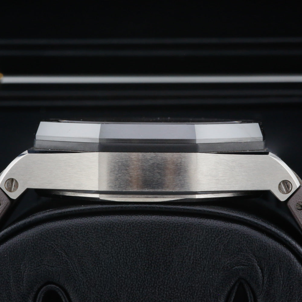 Some of our favourite features on this watch are the stunning Rhodium dial, chronograph function, scratch-resistant ceramic bezel, lightweight titanium case, and open case back. The grey dial is beautifully textured and even has a date window at the 3 o'clock position. What more could you ask for from a luxury watch?
